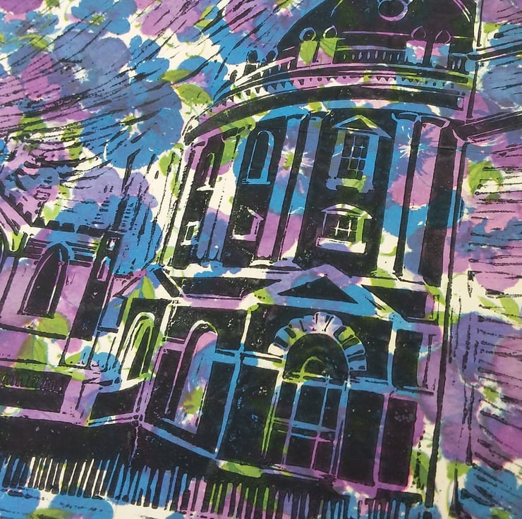 Mixed media original print of the Radcliffe Camera, Oxford. Linoprint is printed in black on blue and purple 1960's floral paper.