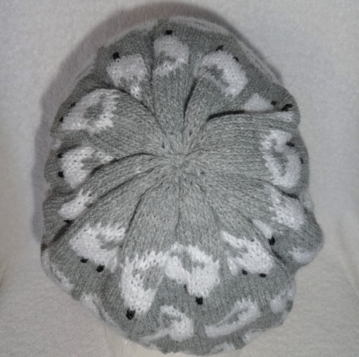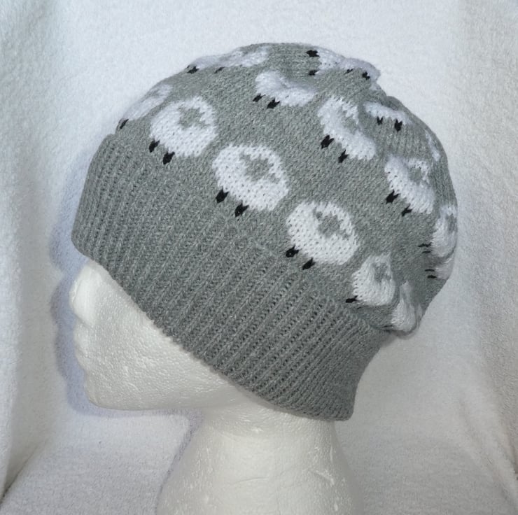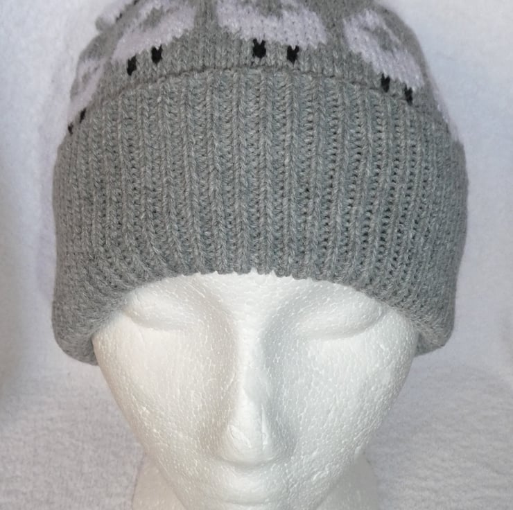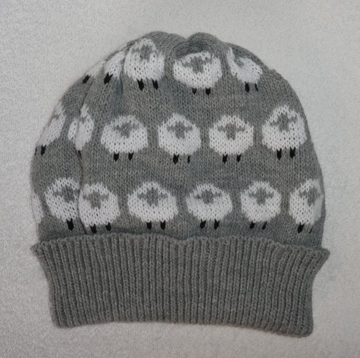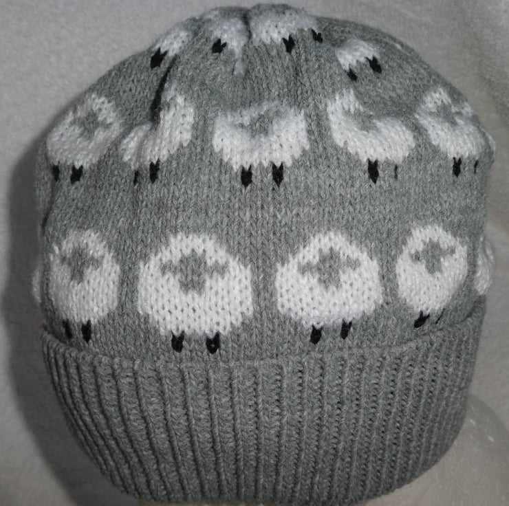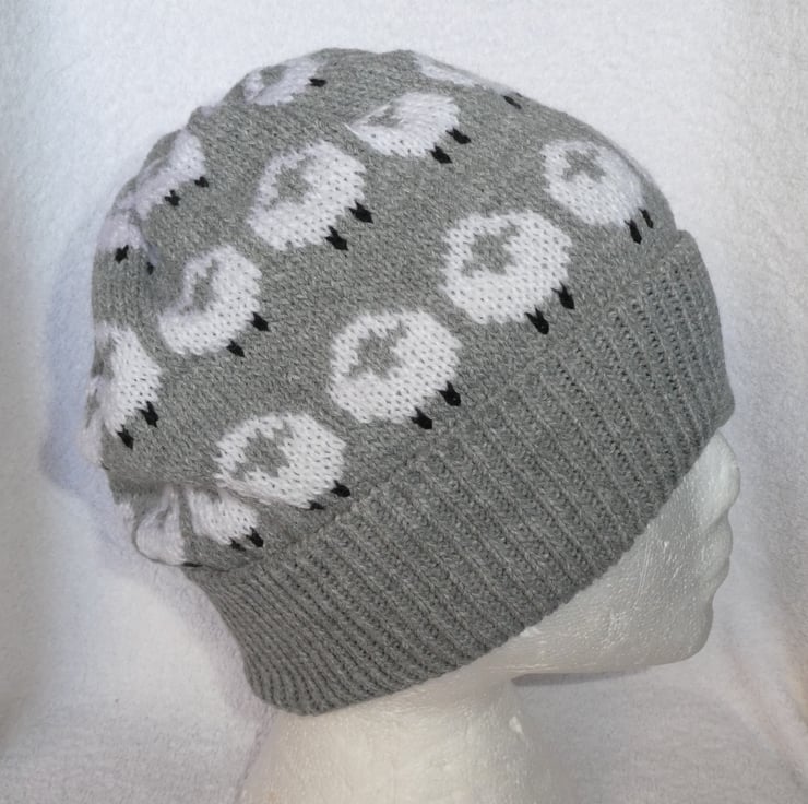I have created this lovely warm hat on a knitting machine. There is a deep 1x1 rib, and a fair isle sheep design. The background is a mid grey yarn, and the sheep are white with black legs. This hat has been knitted flat, and finished by hand sewing the back seam and gathered at the top.