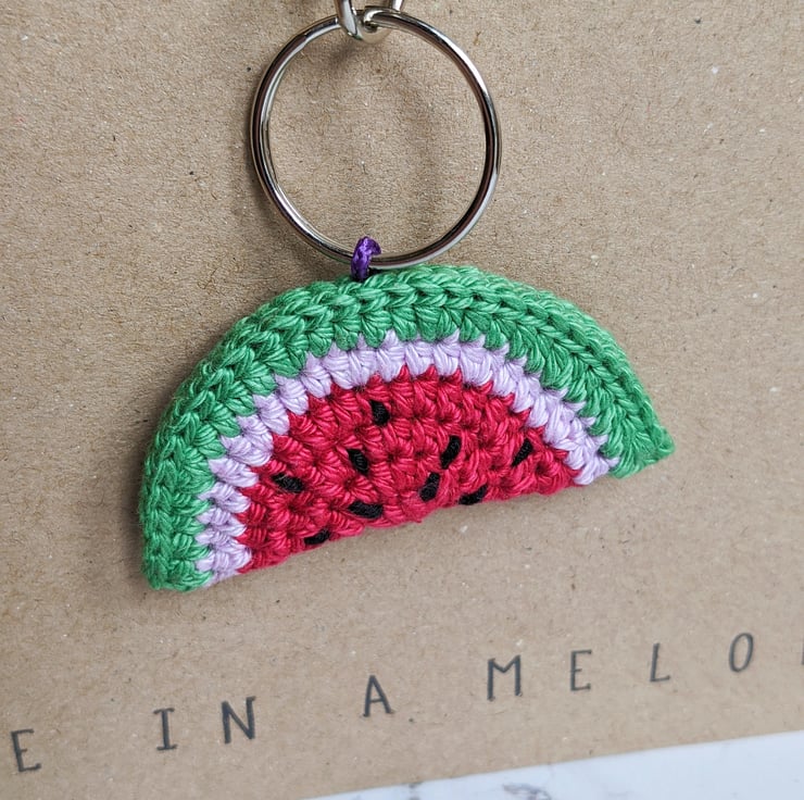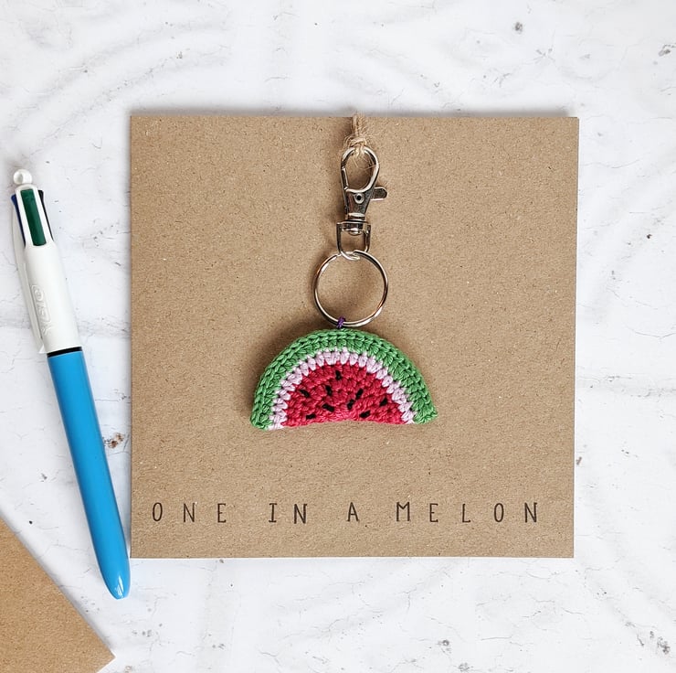 Greeting card with a detachable crochet watermelon key ring/bag charm.