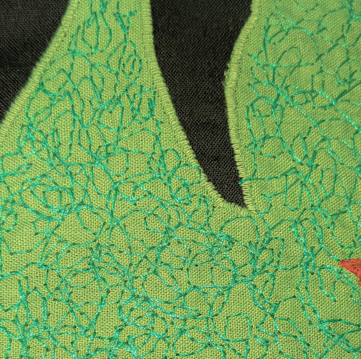 The green appliqué panel is machine edged and detailed with darker green thread using a free motion embroidery technique. The same green is used on the reverse to give some contrast.