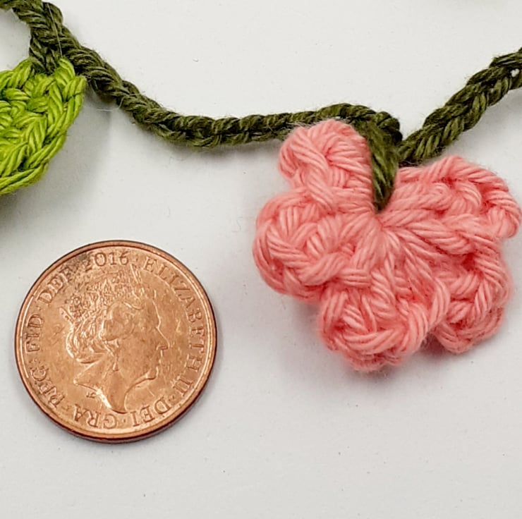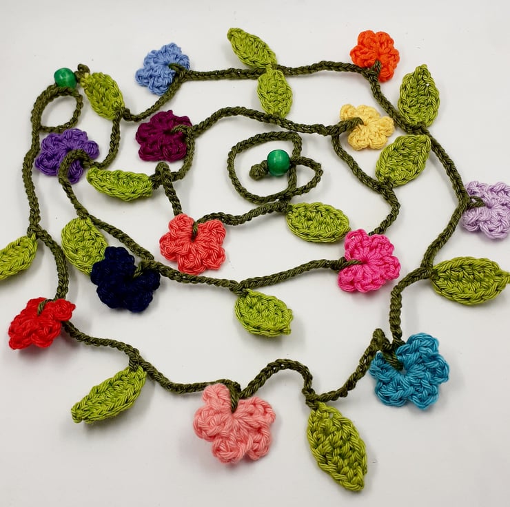 This happy garland of flowers and leaves is crocheted in cotton and has a wooden bead at each end for easy tying. The whole garland measures approximately 137 cm in length and comes wrapped in tissue in a labelled PIP (Postage in Proportion) box, all ready to be given or posted on as a gift if required. A tag with a printed message of your choice can be added to the box, please just message me if placing an order.