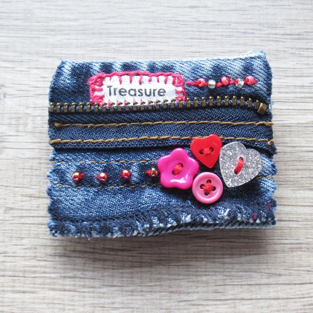 It is handmade with up-cycled jean fabric, embellished with pink embroidery stitched detail, buttons and beads in pops of pink and red and features the typed word ‘Treasure’. The design is completed with a sparkly crystal heart.