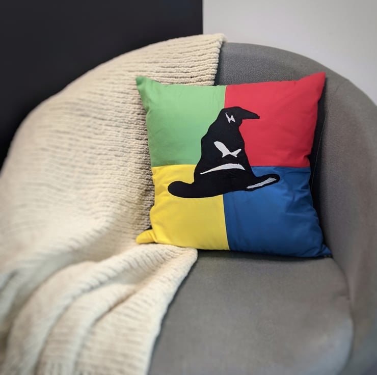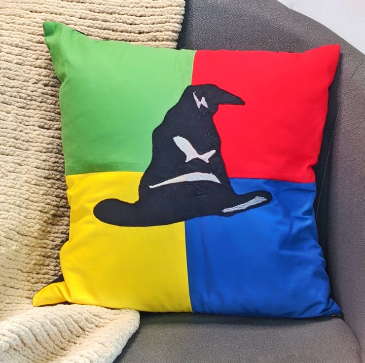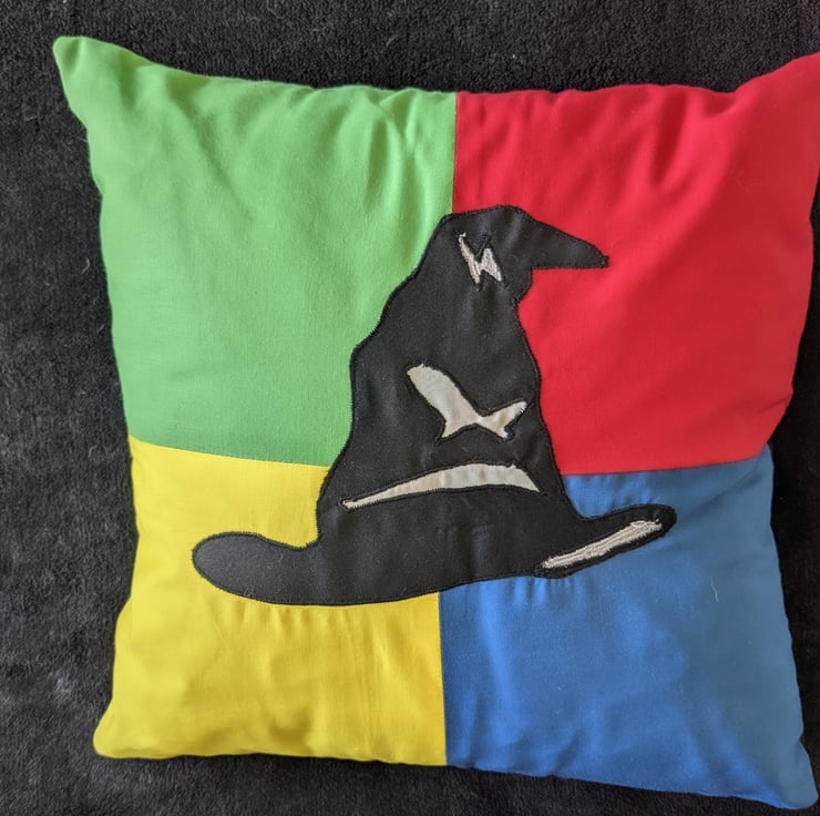 An appliquéd cushion in a patchwork of the four House colours of Hogwarts with a machine edged Sorting Hat panel. The mouth and eyes are backed with cream and the shading is embroidered with grey.
