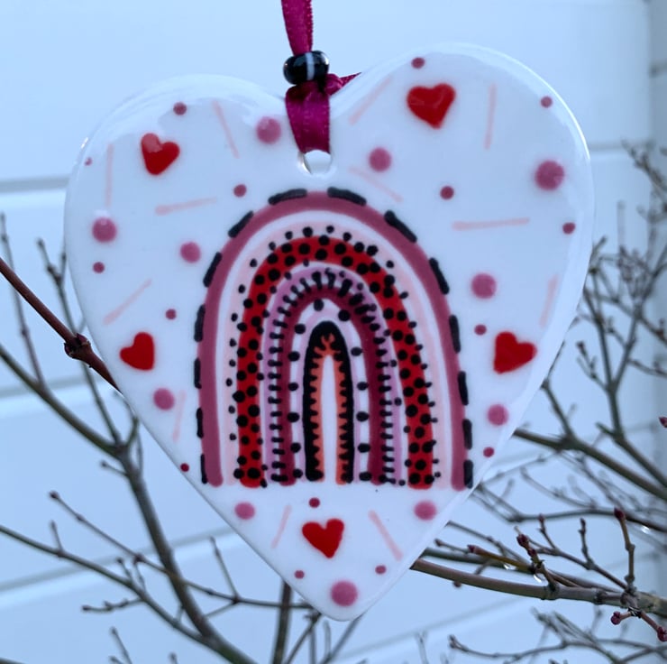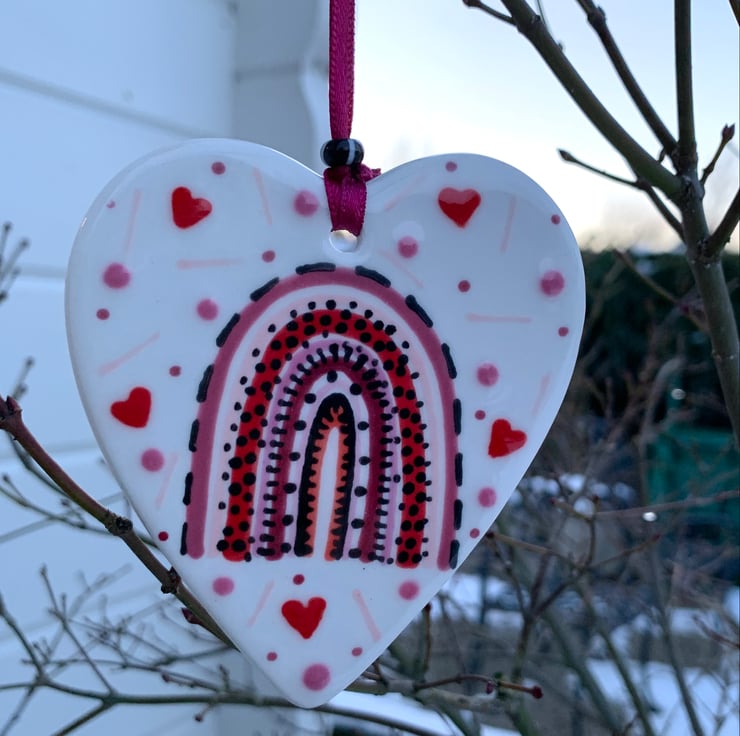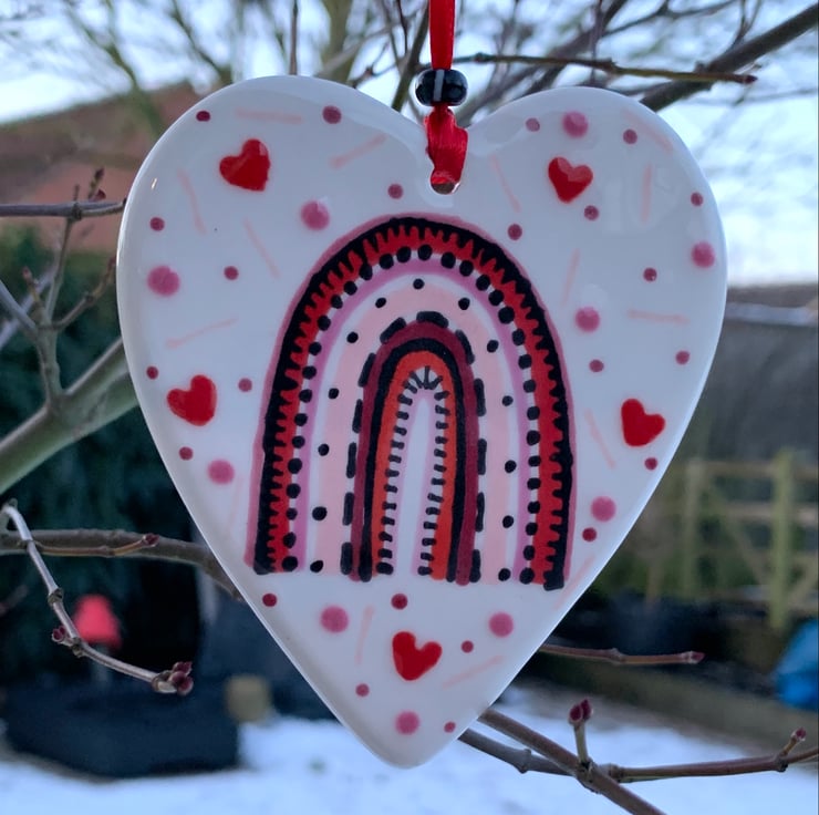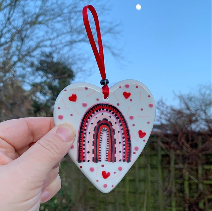 Each rainbow is hand painted on to a white earthenware heart shaped hanger using underglaze paints. Black doodles and delicate coloured confetti are also hand painted making each hanger completely unique. Once painted the hangers are dipped in a glossy transparent glaze and kiln-fired. Once fired each hanger is individually strung together with a coordinated satin ribbon and bead and is ready to hang.
