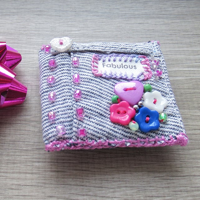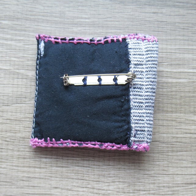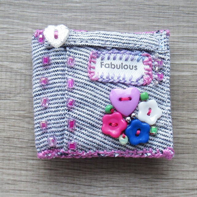 It is handmade with upcycled striped cotton fabric, detailed and embellished with pink embroidery stitched detail, pink, blue & white flower buttons, a lilac heart button, shiny sparkling silver heart button and shiny pink, green and silver beads all hand sewn on and finished off on the reverse with a silver toned safety catch brooch back.