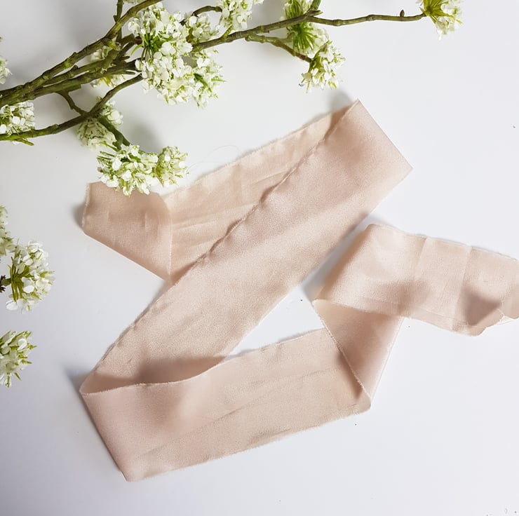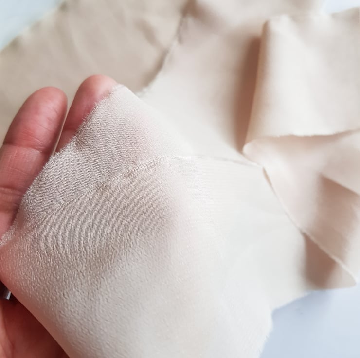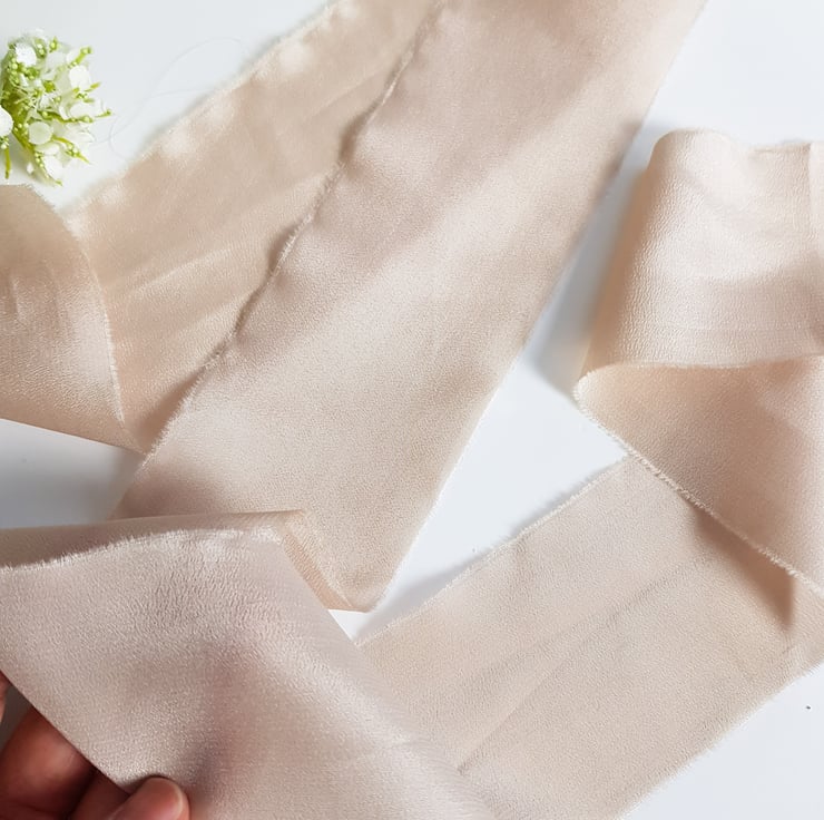Lovely 100% silk crepe de chine ribbon with raw, frayed edges in a beautiful pale sand colour.