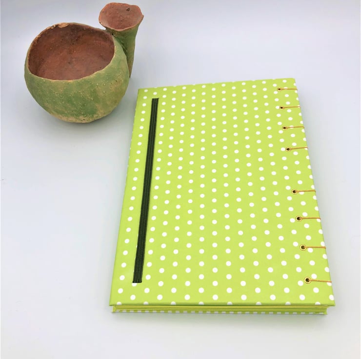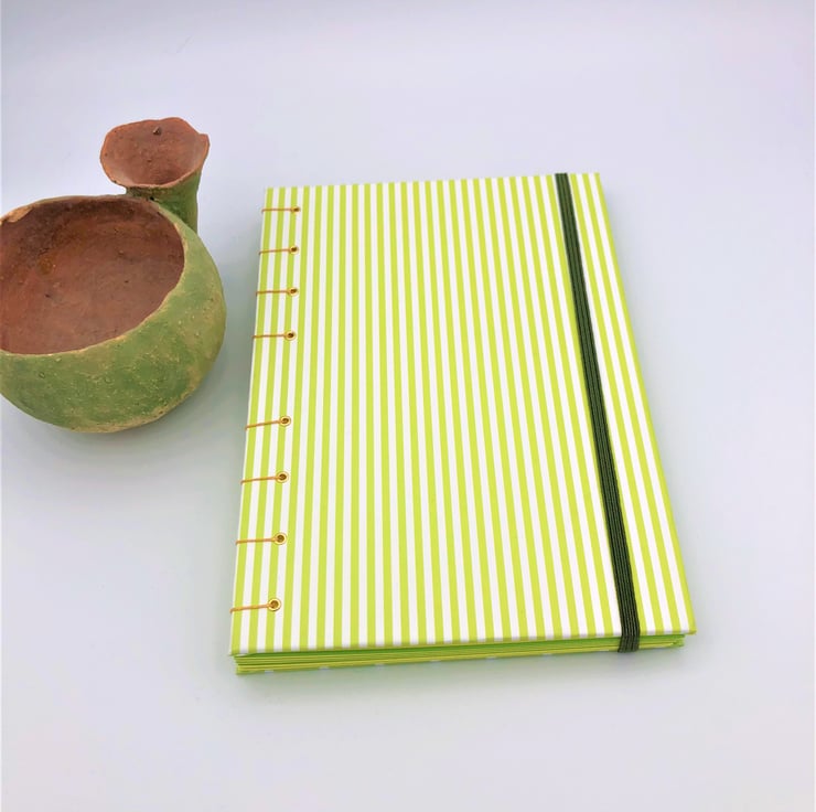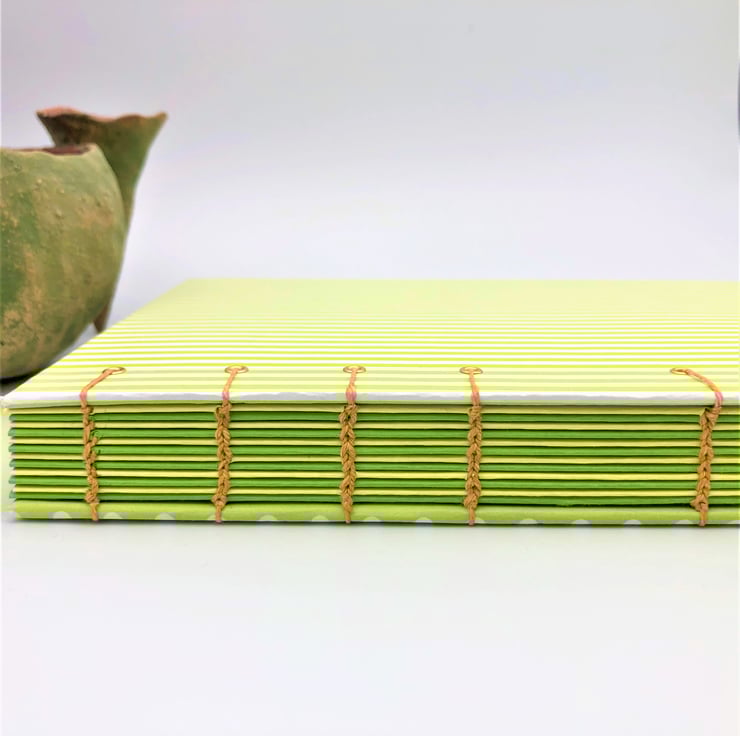 Green and white dots and stripes make a fun approach to this A5 coptic stitch notebook - is it a dots day or a stripes day? You can open the book from either end!