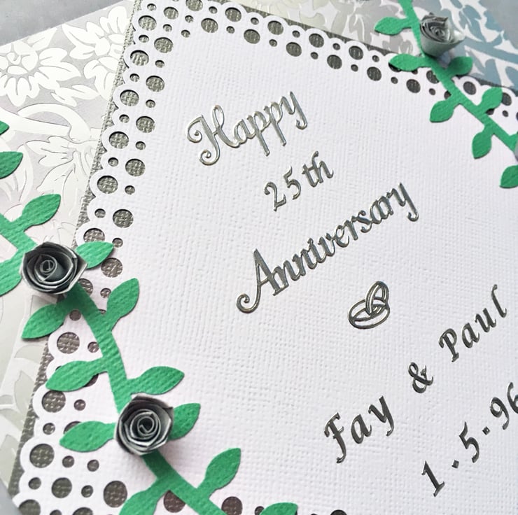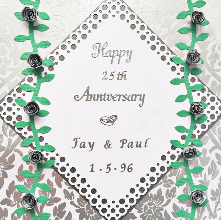 The silver foiled background is embellished with hand quilled roses and is personalised with the names of the bride and groom and their date of marriage.
