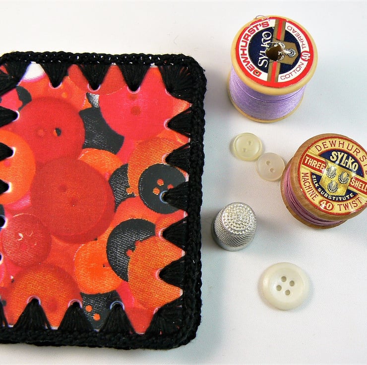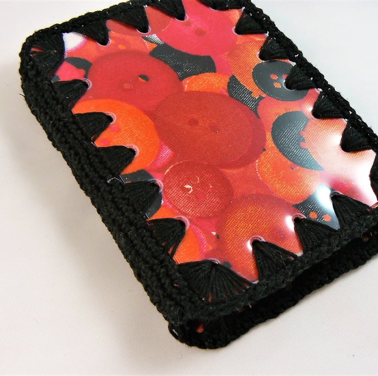 This needle case is made using a red button print material (inside and outside) sandwiched in between sheets of Acetate for a wipe clean finish. I have crocheted the edge with black yarn and on the inside there are two sheets ( four pages) of black felt fabric to accommodate the needles.