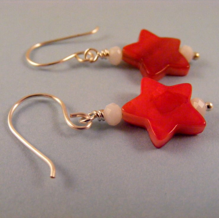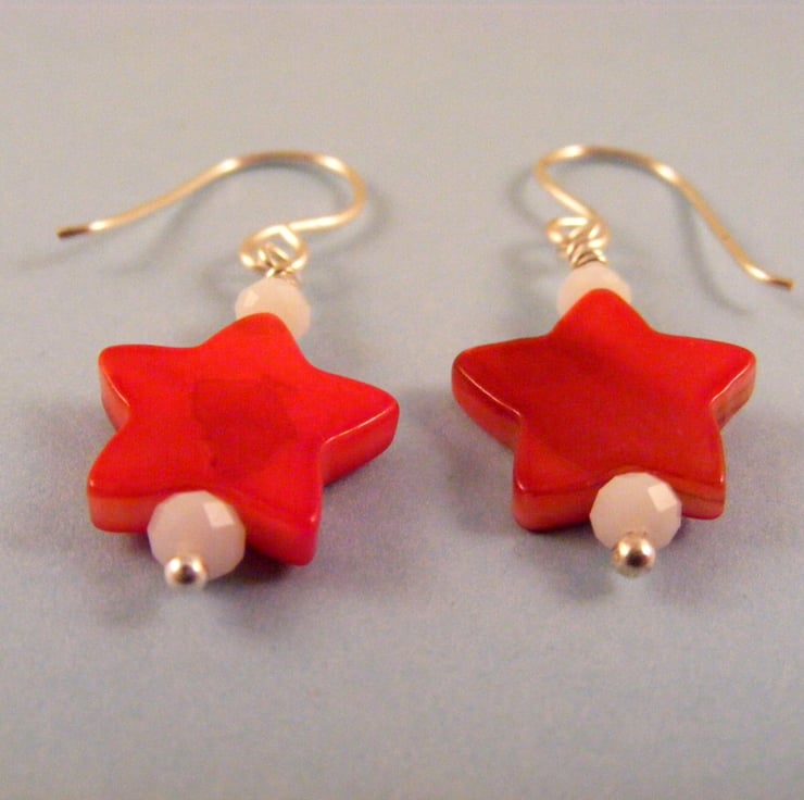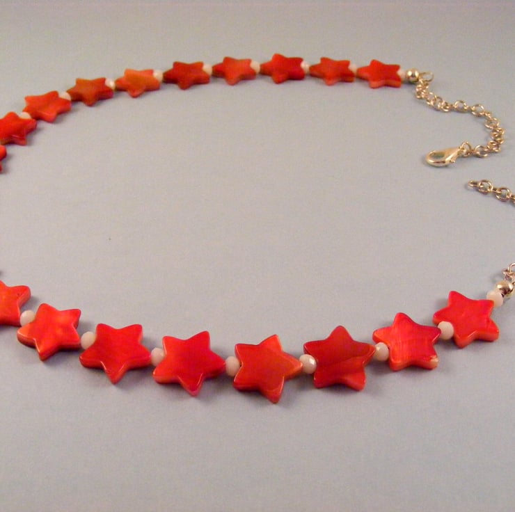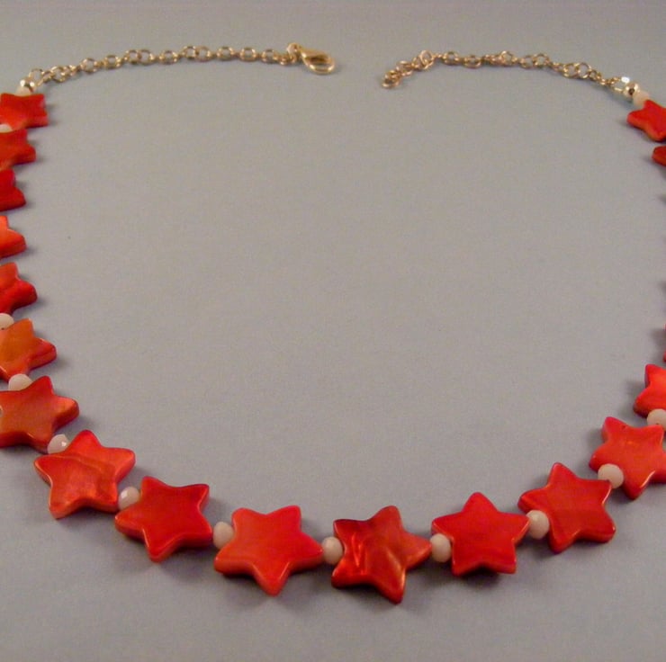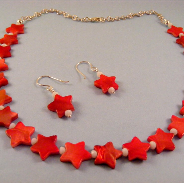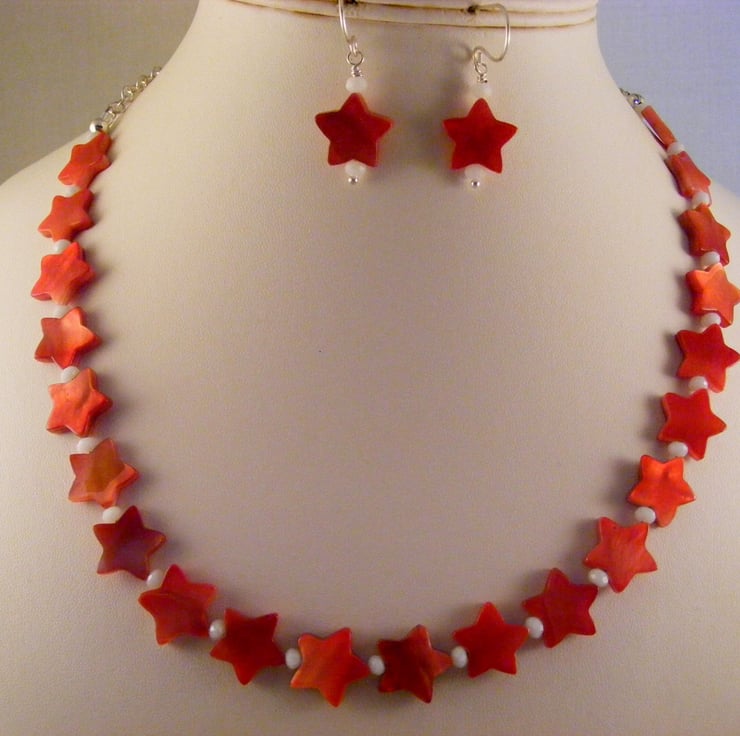 I've handmade this lovely jewellery set which consists of a necklace with matching earrings, using, 14 mm red shell stars, 3 x 4 mm opaque white crystal rondelles, silver plated rolo chain, silver plated findings, lobster clasp and wire to make the ear wires. Wire is hypo allergenic and resistant to tarnishing.