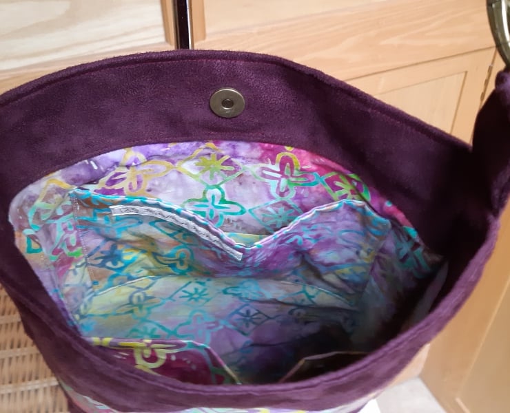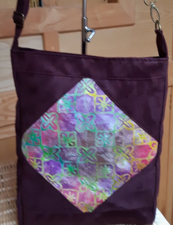 Maroon faux suede bag with a batik panel and matching lining. Inner pockets, magnetic fastener and adjustable strap long enough to go crossbody if required.