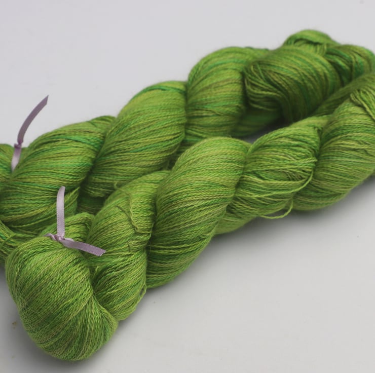 Soft shades of lime, olivine, chartreuse and apple greens. This gorgeous and luxurious yarn has the softness and warmth of alpaca with the smooth sheen and cool feel of silk. It should make beautiful lace projects. There is one skein left. Photographs have been taken and edited in bright but wintery natural light.