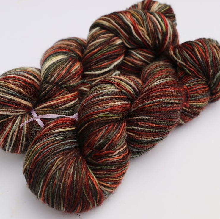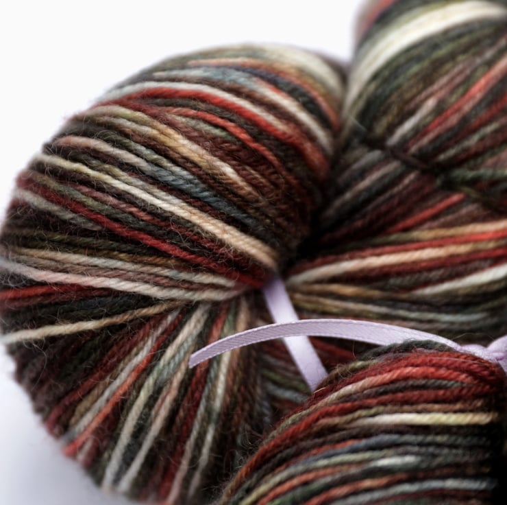 The first flakes of snow on bare branches. In mottled shades of rust, dark green, brown, orange and off-white (undyed), this colourway looks like a relation of my occasionally repeating colourway 'Lochside' despite being dyed with a different selection of dye colours. This Bluefaced Leicester superwash yarn is soft with a very slight lustre. There is one skein left and it is the more variegated skein with more off-white sections as shown in the first photo and to the rear of the second photo. Photos taken and edited in bright but wintery natural light.
