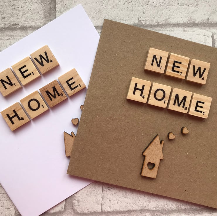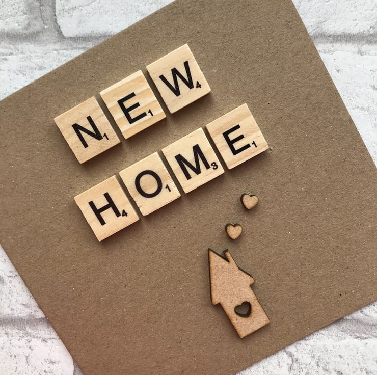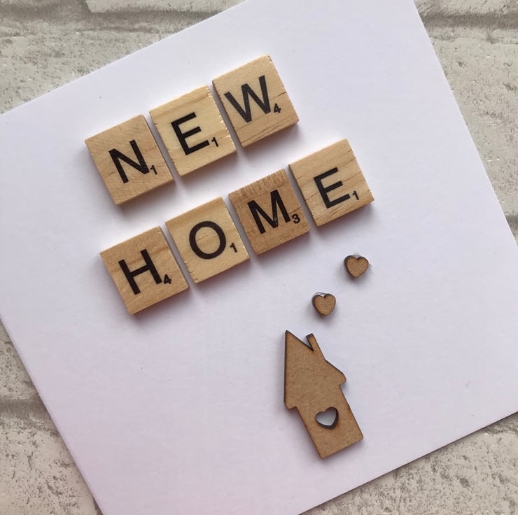 Made by myself in Northamptonshire it features a cute mdf house on chosen card stock with New Home greeting spelt in scrabble tiles.