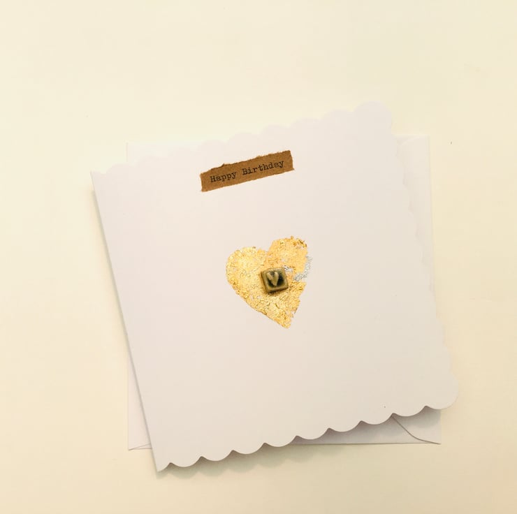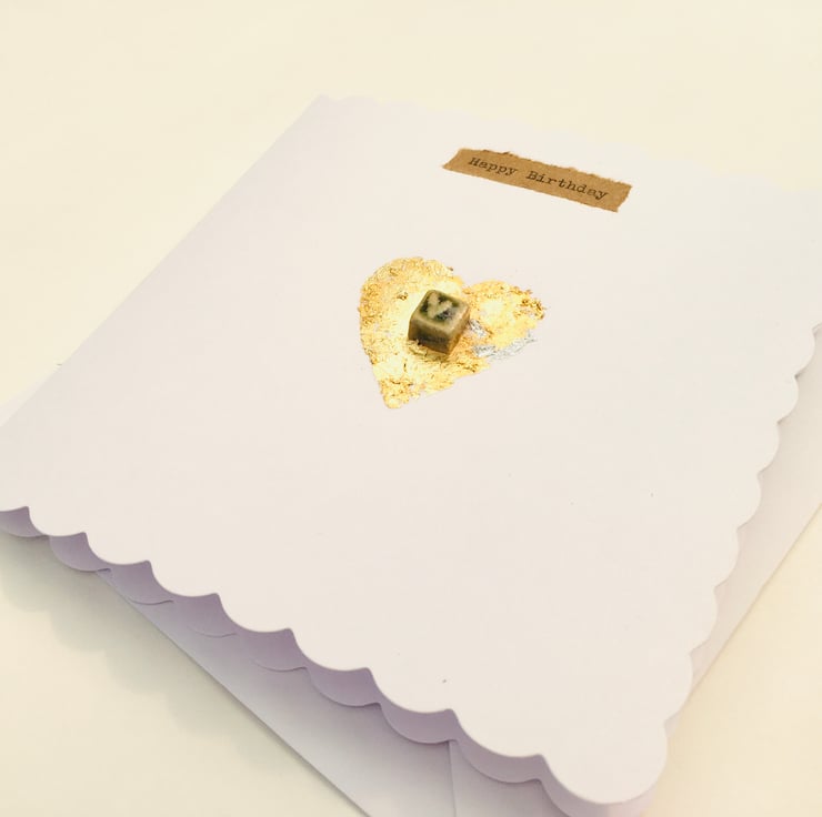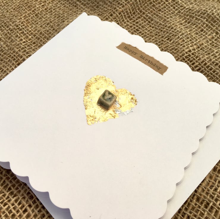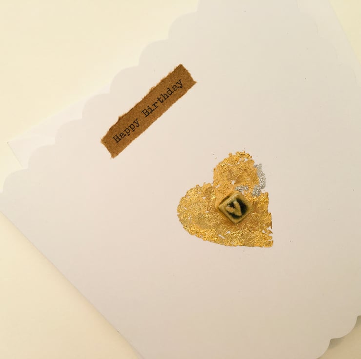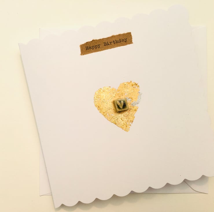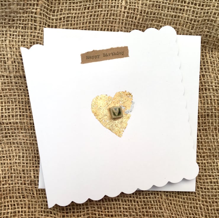 The card is 100% hand made by myself. It has a ceramic charm attached to the card which is placed onto gold leaf made onto a heart shape.