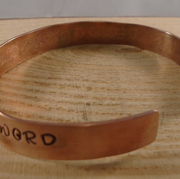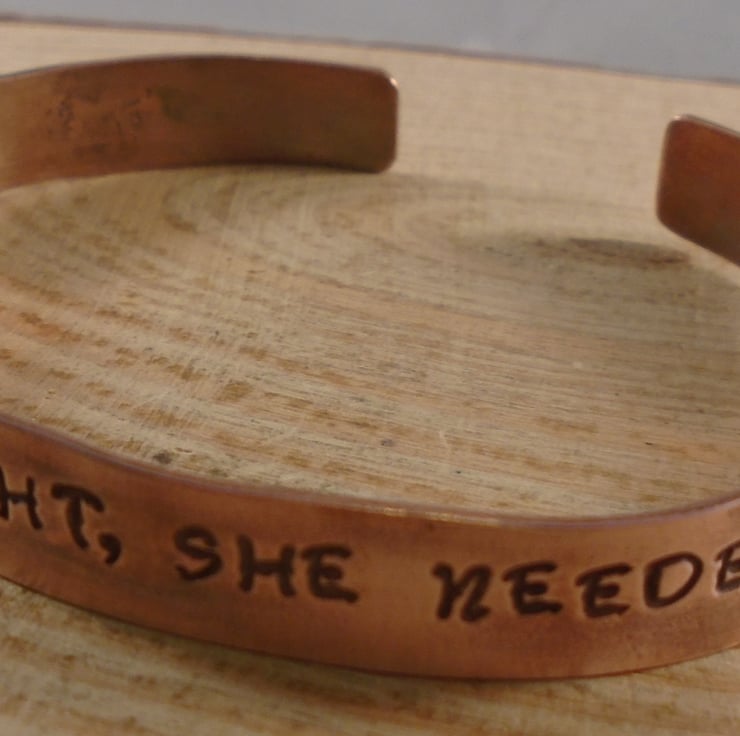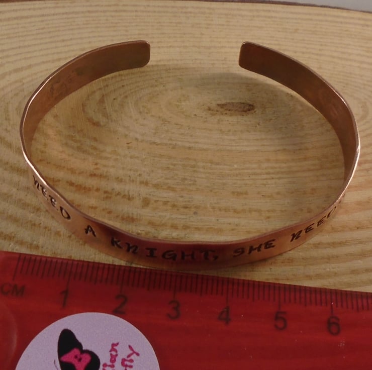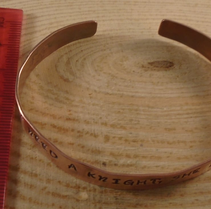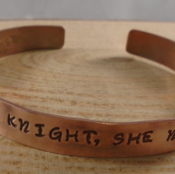 A positive, stamped bangle, hand made from copper. A 1cm wide strip has been hand pierced from a sheet of copper. It has then been hand stamped with the words 'She didn't need a knight, she needed a sword'. The strip has then been bent around a mandrel to form the bangle, and the wording has been oxidised to blacken it.