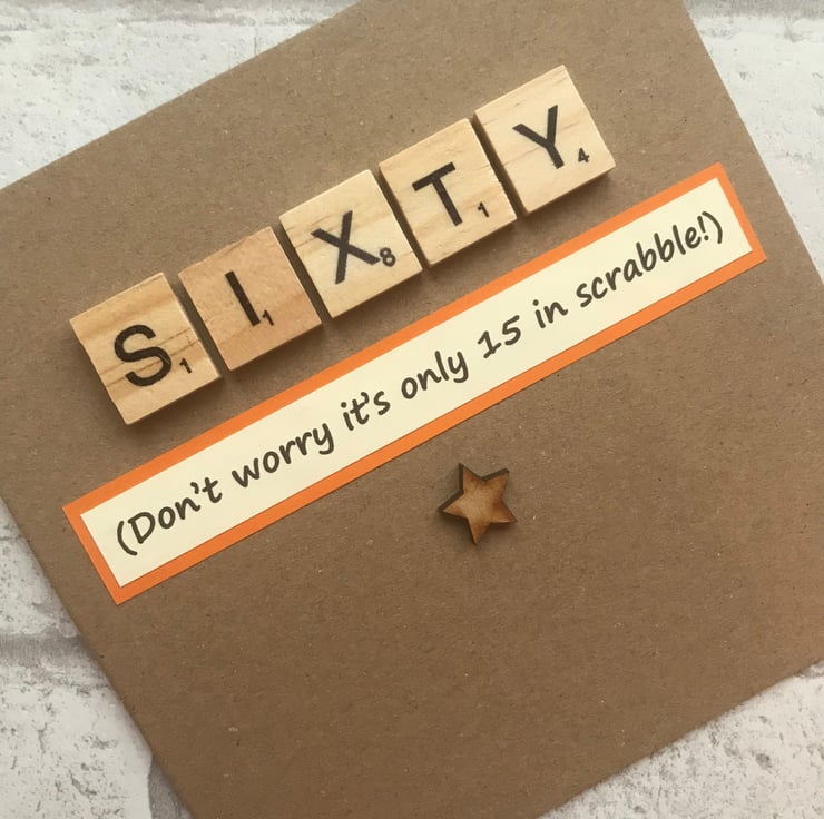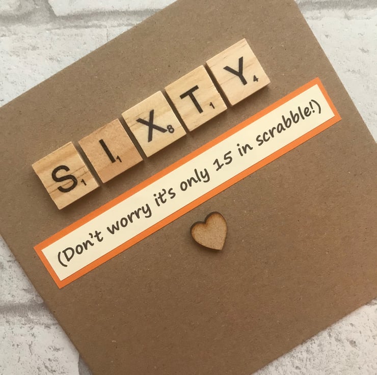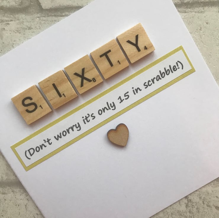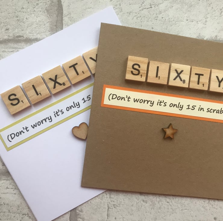 Made by myself in Northamptonshire it features wooden scrabble tiles and your choice of mdf hearts or stars which are stuck onto chosen card stock. A printed greeting is added which states that Sixty is actually only 15 in scrabble. The inside is left blank for your own message.