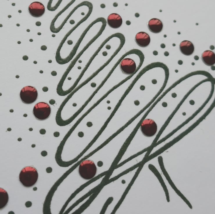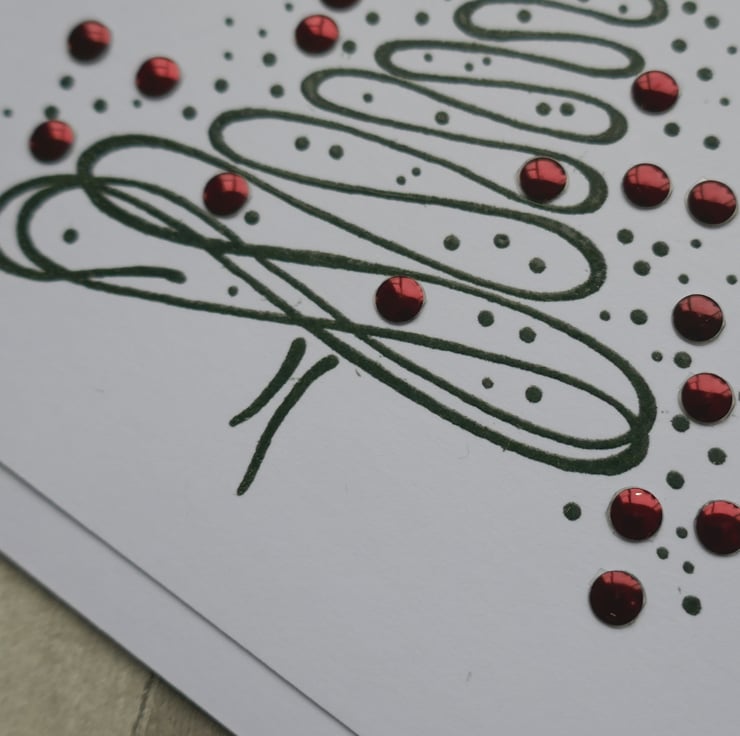 The modern Christmas tree has been stamped in green ink onto white matt card before being embossed to give a lovely shine. Small red enamel dots have been added around the tree. The corners have been rounded on the stamped panel and it has been attached to the front of the card leaving a small border around the edge.
