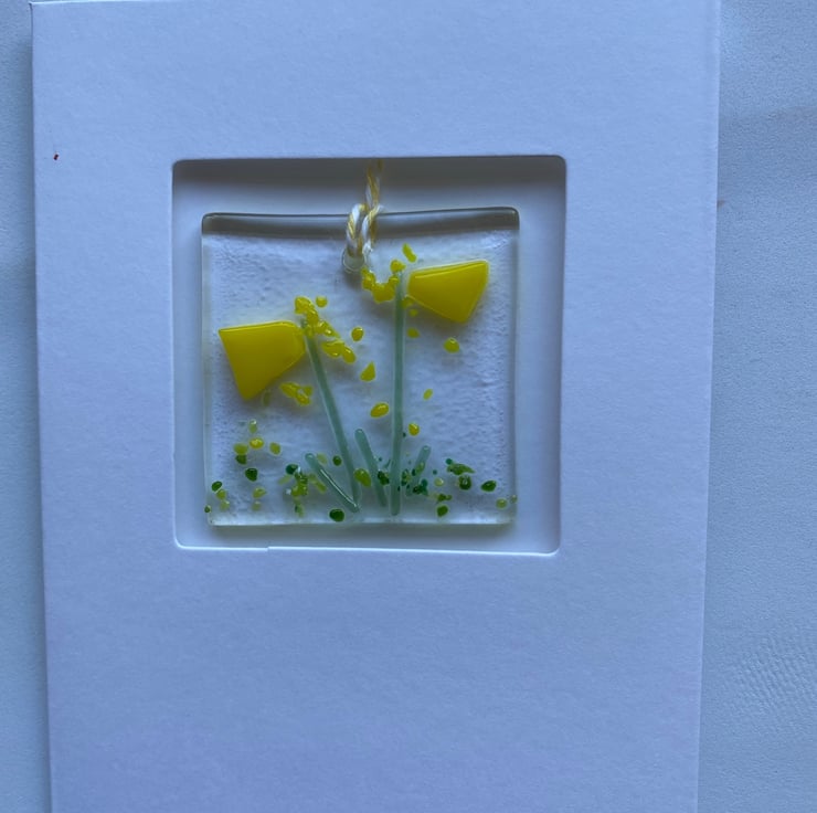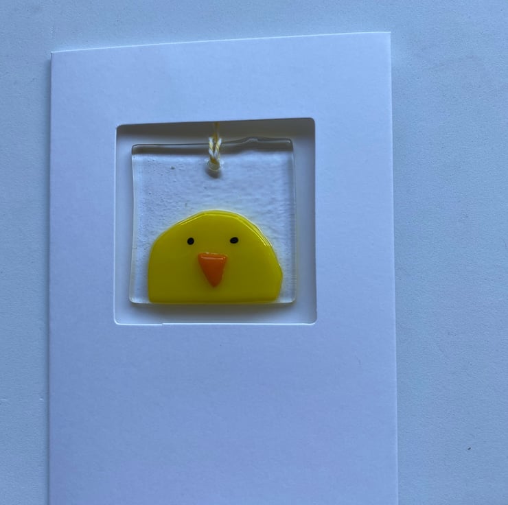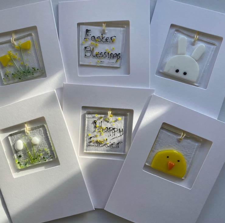 A handmade fused glass hanging decoration which makes a lovely keepsake after the card is given. Each decoration is hand cut from a base glass and hand built using a variety of different types of glass. They are then fired in the kiln for up to 24 hours. Each is hand drilled and a hanger is threaded and then applied to a blank tri fold card which makes them suitable for so many occasions. Each card comes with an envelope. These are ideal for giving a small unique gift for Easter. The cost is for a set of 6 cards. Please contact me if you wish to buy a different number of cards. They will be £3.95 each plus posting