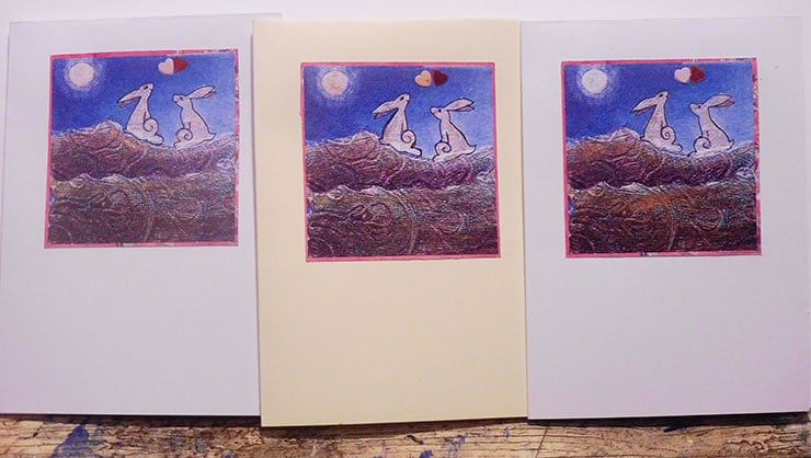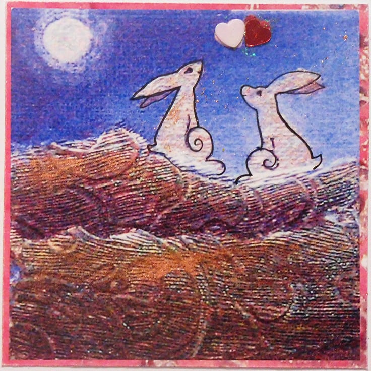 Two little hares under a full moon. Greeting card print from an original mixed media artwork. Embellished by hand with gold pigment powder and two shiny hearts. A6 sized on good quality card with envelope. Card is blank for your own message, but could be good for Valentine's Day. Choice of cream or white card, please specify when ordering.