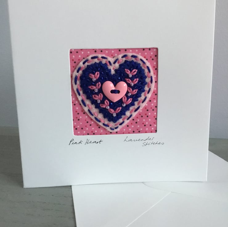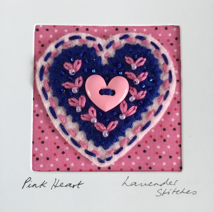 This Hand Embroidered Pink Heart Card has a pink heart button stitched onto a pink and blue felt heart. This heart is hand embroidered with Running and Lazy-Daisy Stitches encrusted with pink and blue seed beads. This lovely embroidered heart sits on a complementary pink cotton fabric dotted with little blue, pink and white spots……it has a folk art feel…..