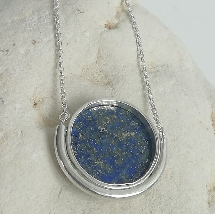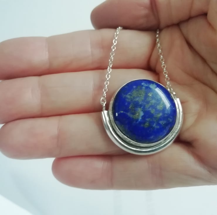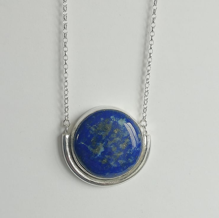 This beautiful 25mm lapis cabochon is bezel set within a handmade semi circle of solid silver round wire. The chain is attached to either end of the semi circle. The stone is a bright royal blue mottled with white and gold splodges. The back of the bezel is open so the marbled pattern on the stone is visible. The necklace measures 46cm.