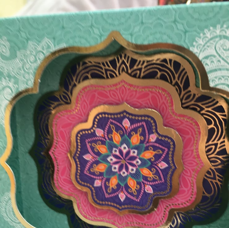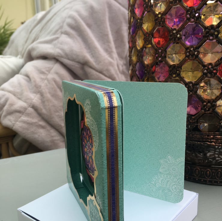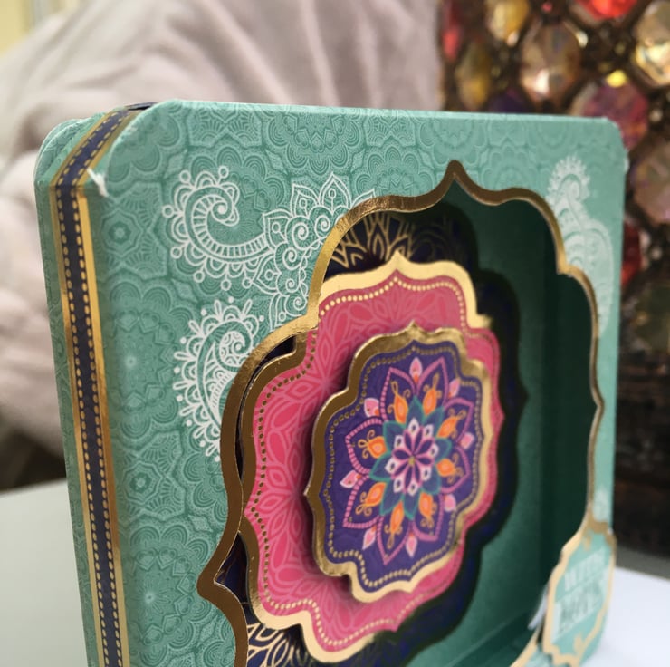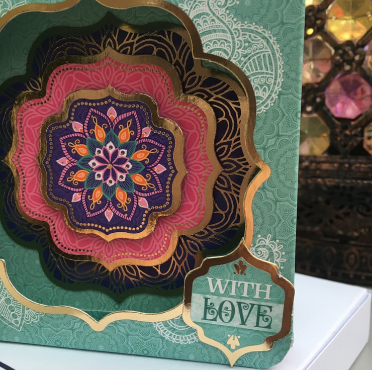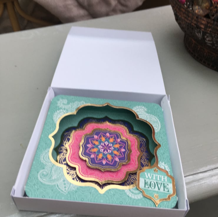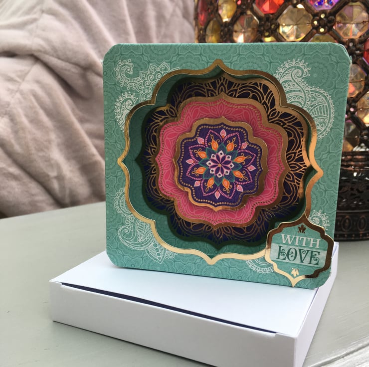 This small but unusual card is a jewelled treasure. The card is 10x10cm box card is packed with colour and pattern. The main colour is a jade green with a white Paisley and mandala pattern. The front of the card has an apature and has a pink, purple and silver mandala decoupage design. The front of the card has a matching greeting that says With love so it is open to being a Valentines, anniversary or birthday card. Inside is blank for your own greeting. The card comes in a box envelope that exactly fits.
