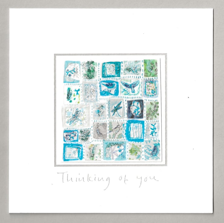 Soothe the blues, thinking of you card, designed and created by the artist Suzanne Hooson, using free machine embroidery and beautiful layered fabrics, hand finished with glitter for an extra sparkle. 'Thinking of you' is handwritten on in silver.