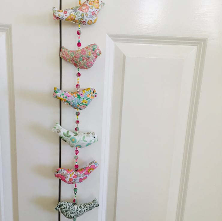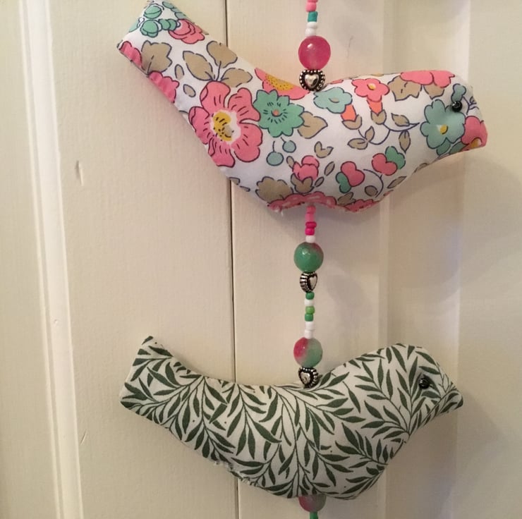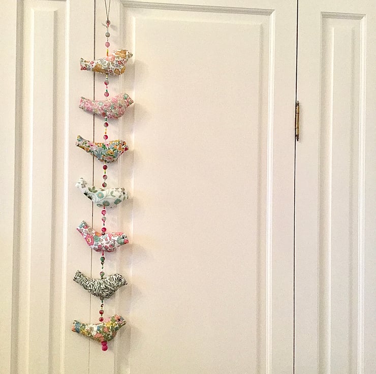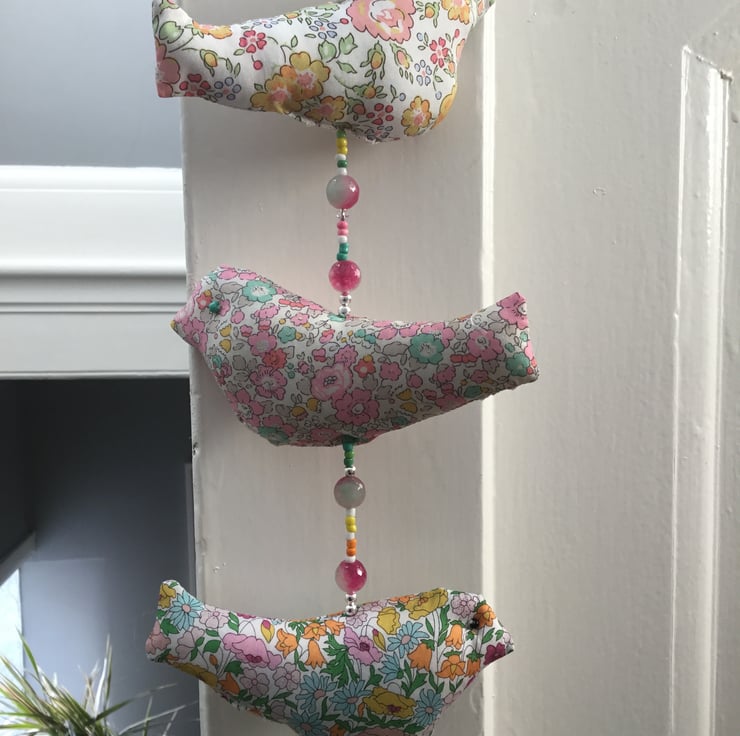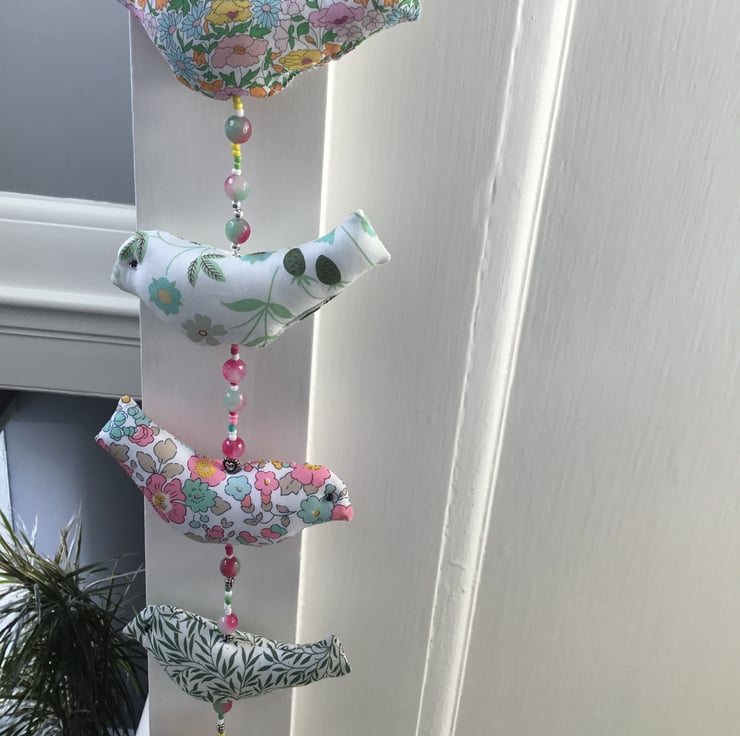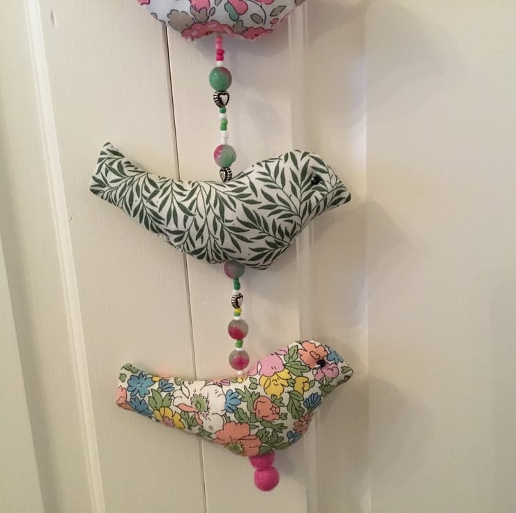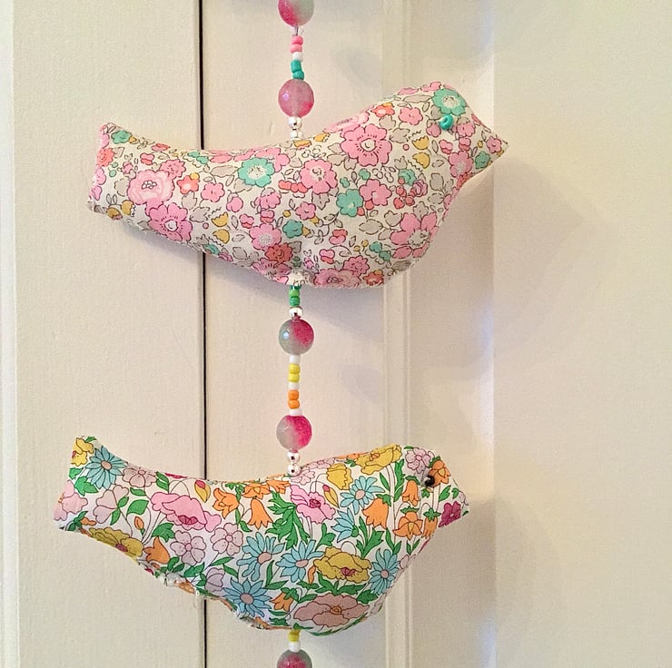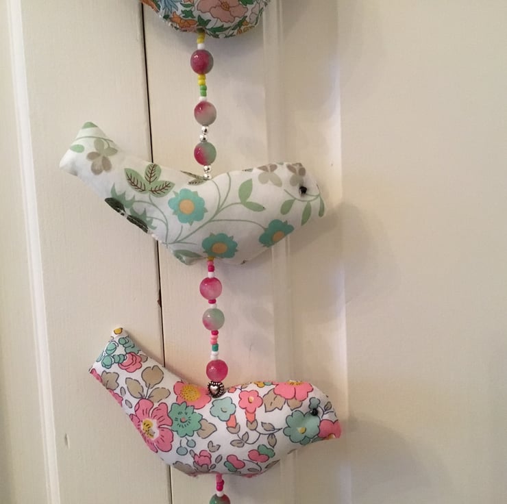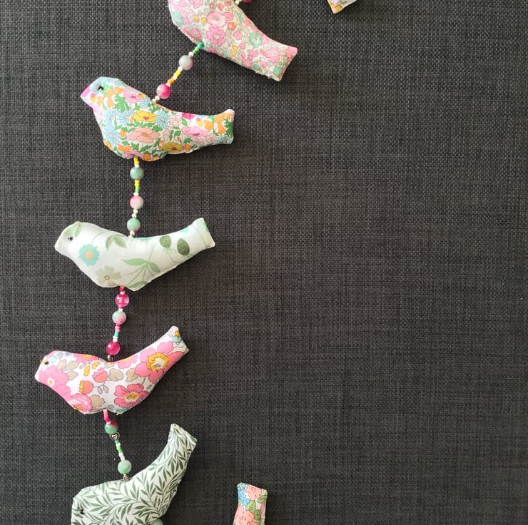 A string of birds made from Liberty fabrics and glass beads. I have used a linen thread and each bird has glass bead eyes, and complementary glass colour beads in between the next bird, there are 7 birds on the string with a hanging loop. There are wool felt Pom Poms on the last bird. Looks beautiful when the sun shines on the crystals. The fabrics are a mixture of mainly pink, green, yellow and orange, and all made from Liberty London cotton.