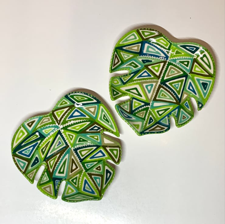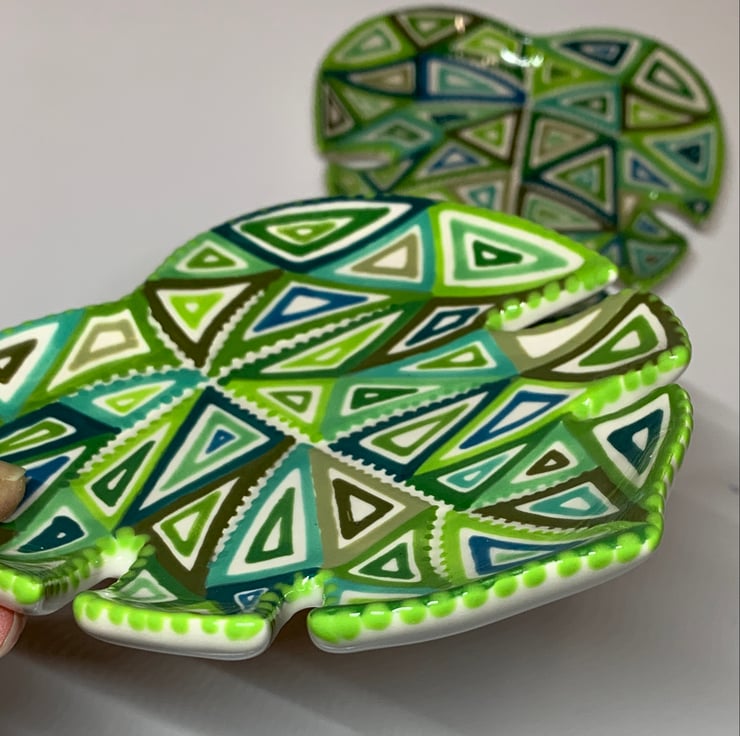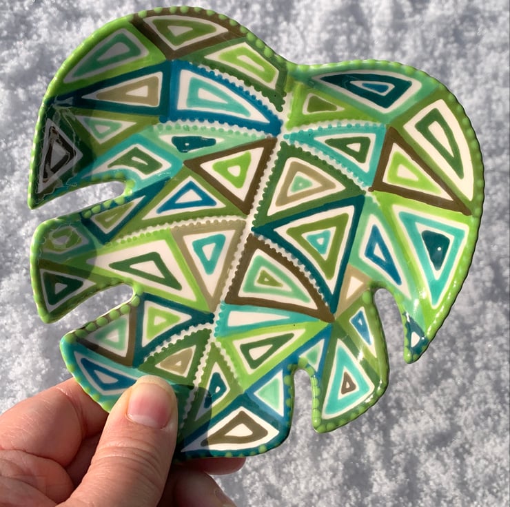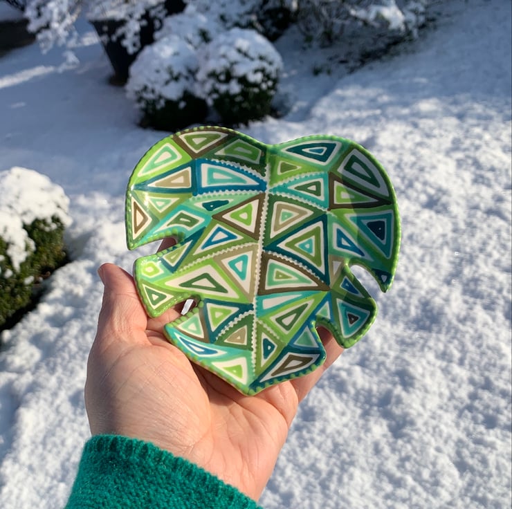 This ceramic Monstera leaf dish has been hand painted with a geometric triangle design in a range of vibrant green underglazes. A series of lime dots frame the edge of the leaf creating a slightly raised bumpy effect once glazed and kiln fired.