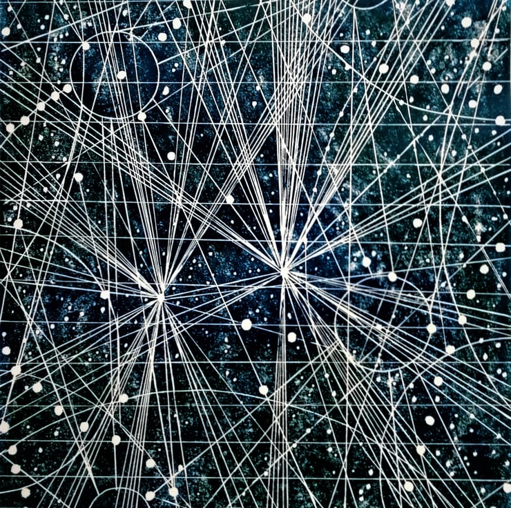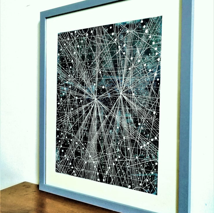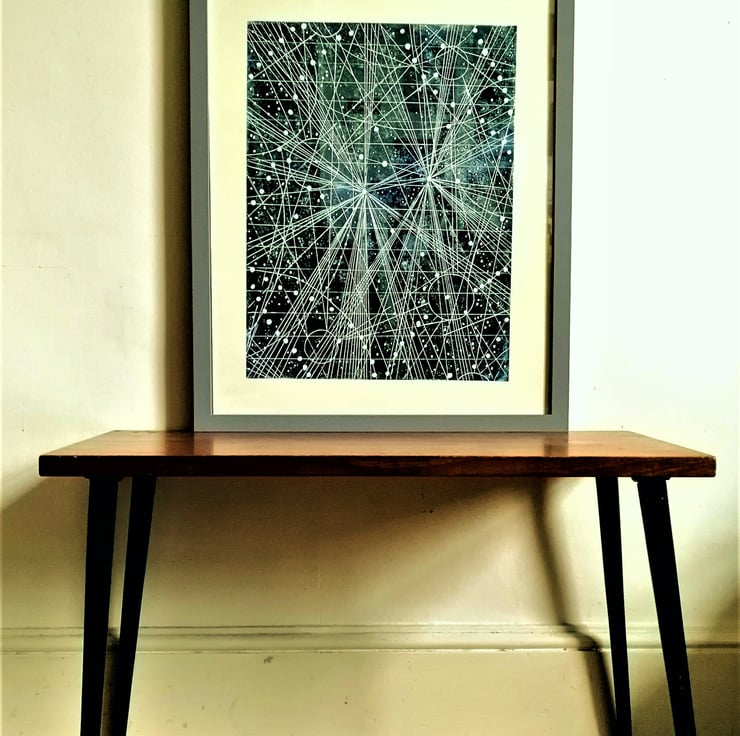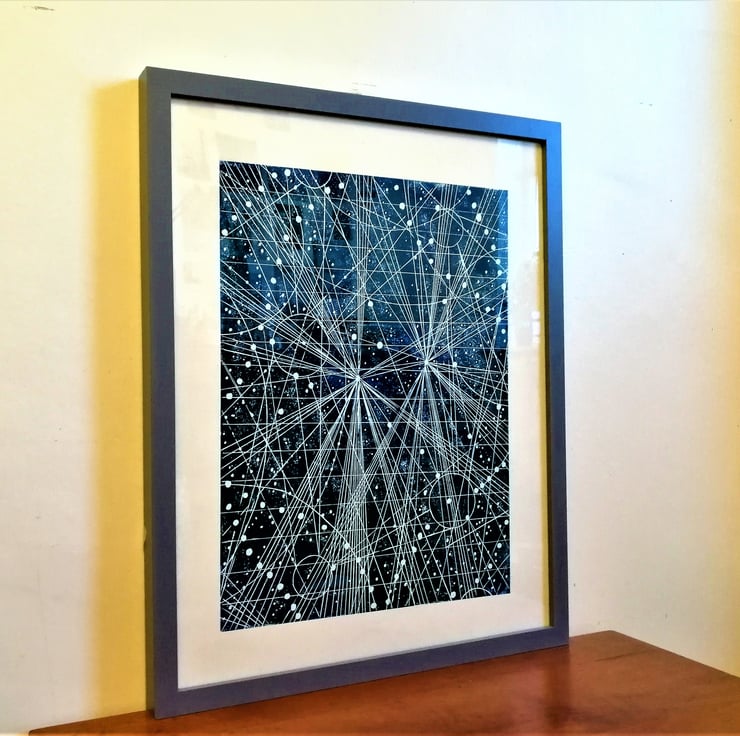Stars and the trajectories of planets are glinting dots and lines, the textures from hand-printing bring depth, creating this geometric Universe. The dark blue and green colours shimmer, depending on the time of day. The whole process is done by hand to achieve textures and character unique to each print.