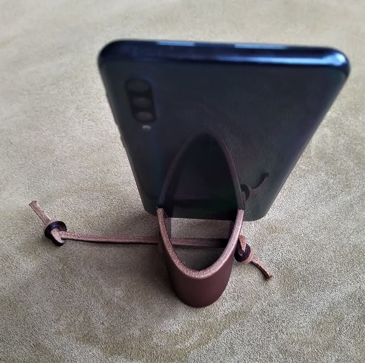 A hand made phone stand made from English bridle leather. A neat, robust little stand, very simple to use and adjust.