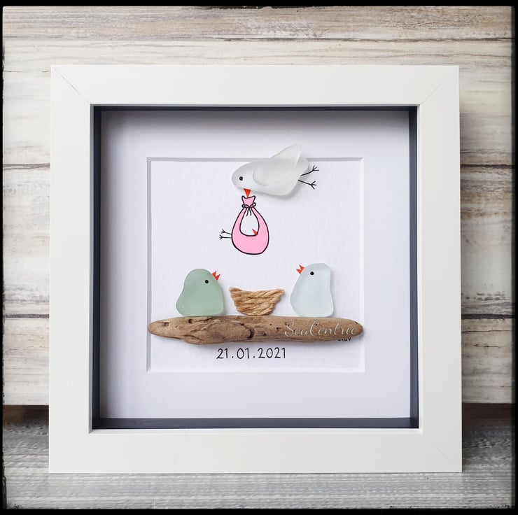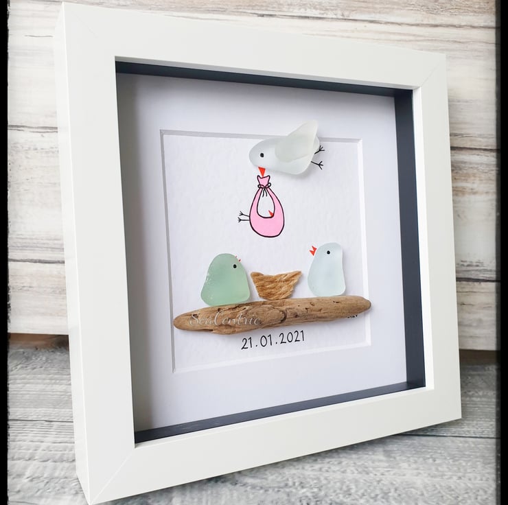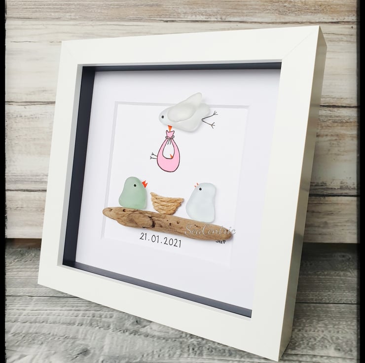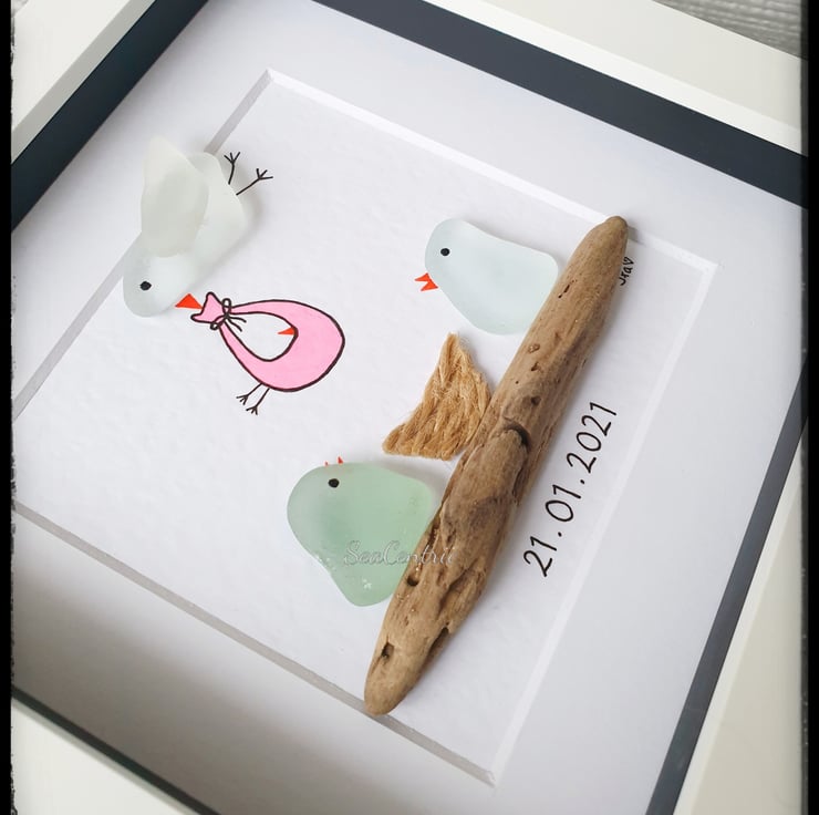 A unique and adorable piece to congratulate the birth of a newborn. This artwork is created with seaglass and driftwood on a textured watercolour paper.
