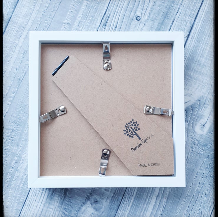 The white frame measures appropriately 17.5cm x 17.5cm. Photos were taken without glass to avoid reflections.