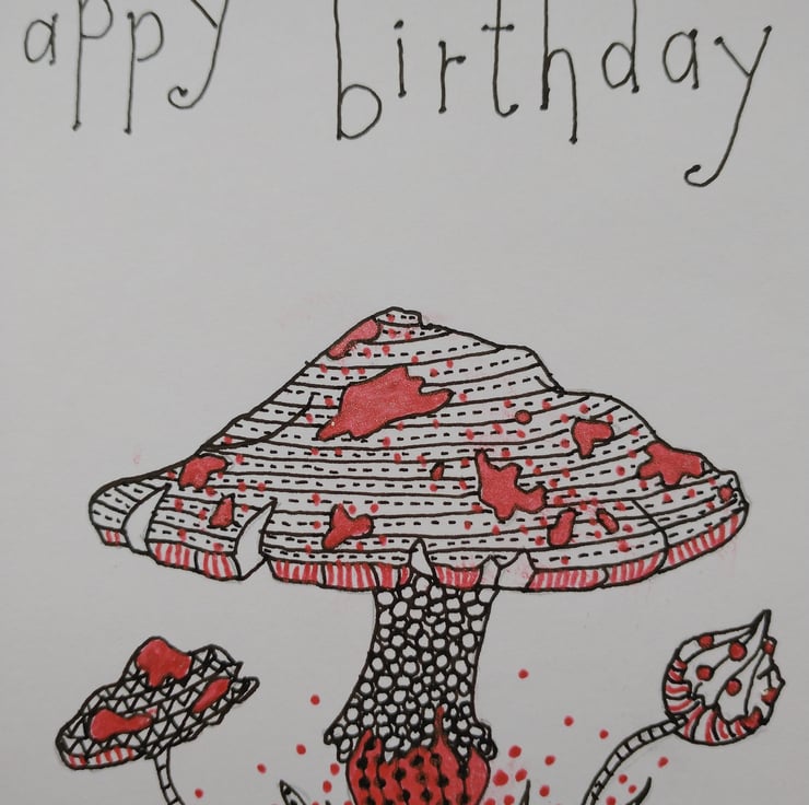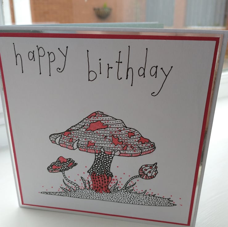 A completely handmade and uniquely designed card. Consisting of pristine white quality card which has a mushroom hand drawn in black ink and hand coloured. Mounted onto red card then silver card. Finished off with happy birthday hand drawn in black ink