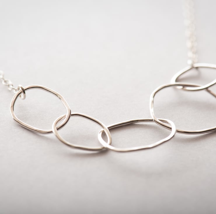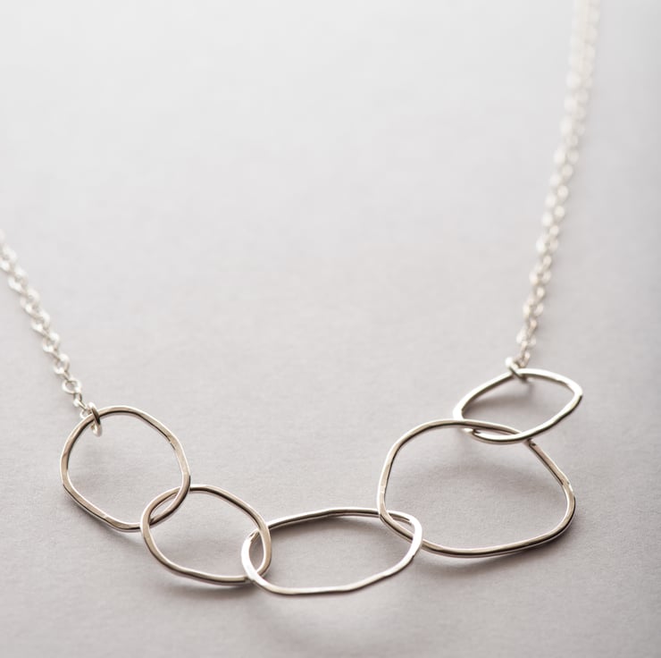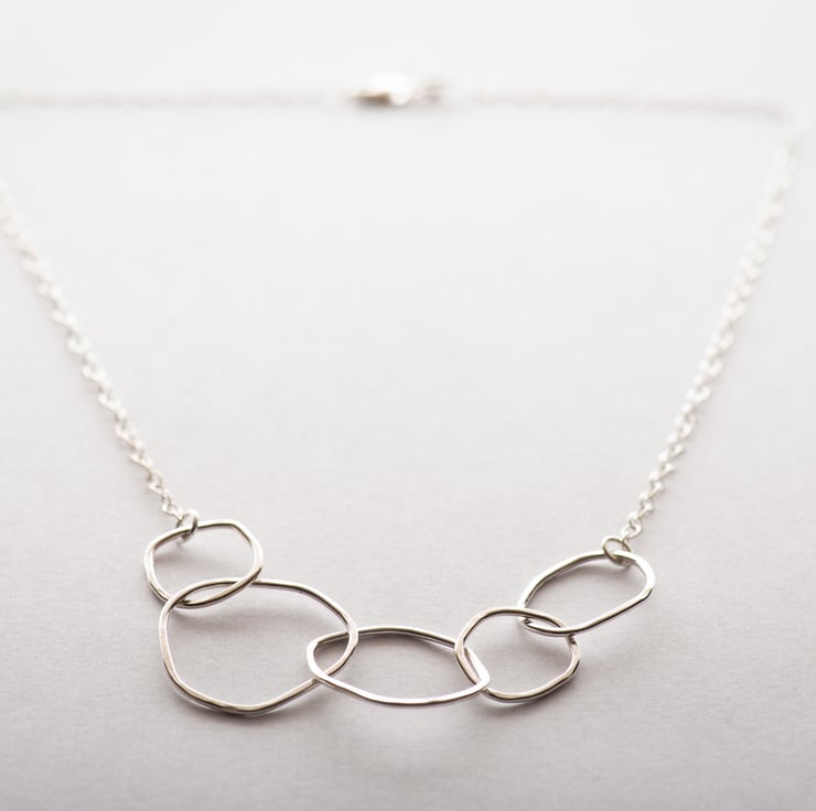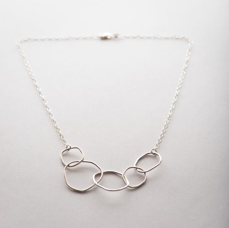 This necklace has been handmade from sterling silver. I used sterling silver wire to create the five organic circle shapes, which have been hand formed, soldered together, and then I have given them a lightly hammered texture.