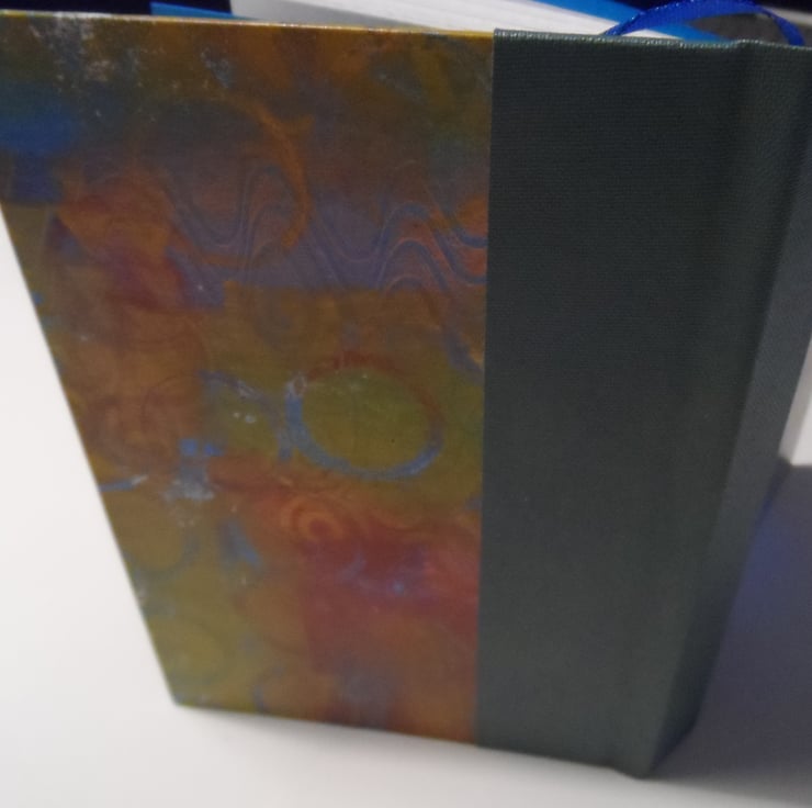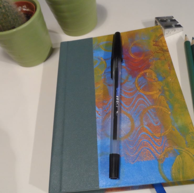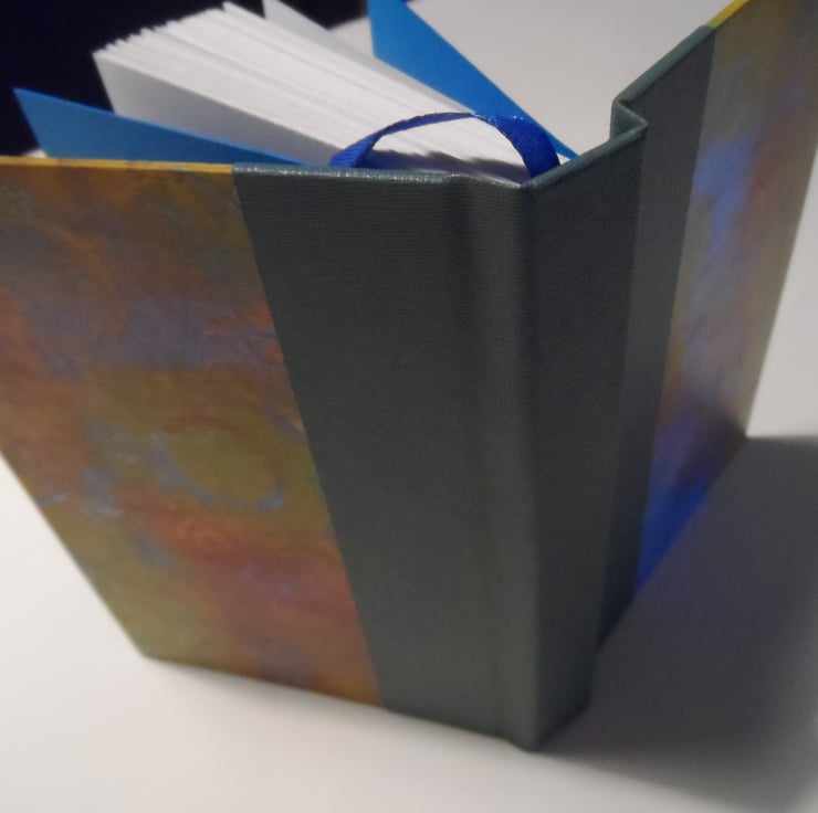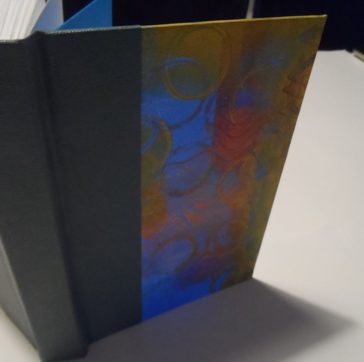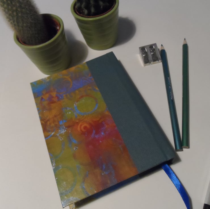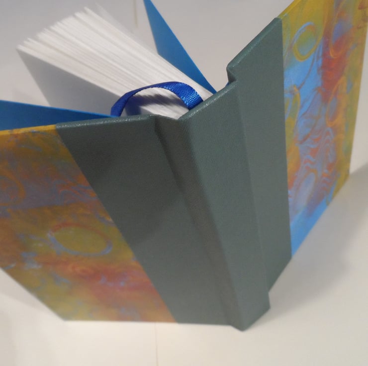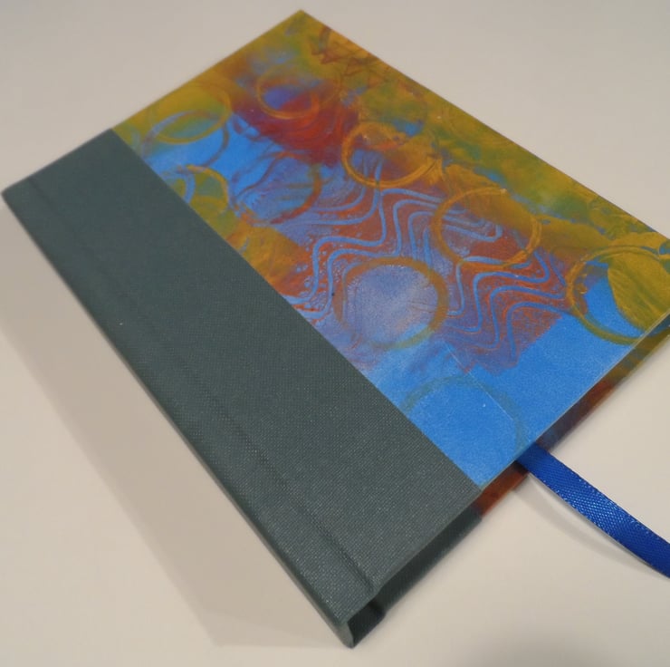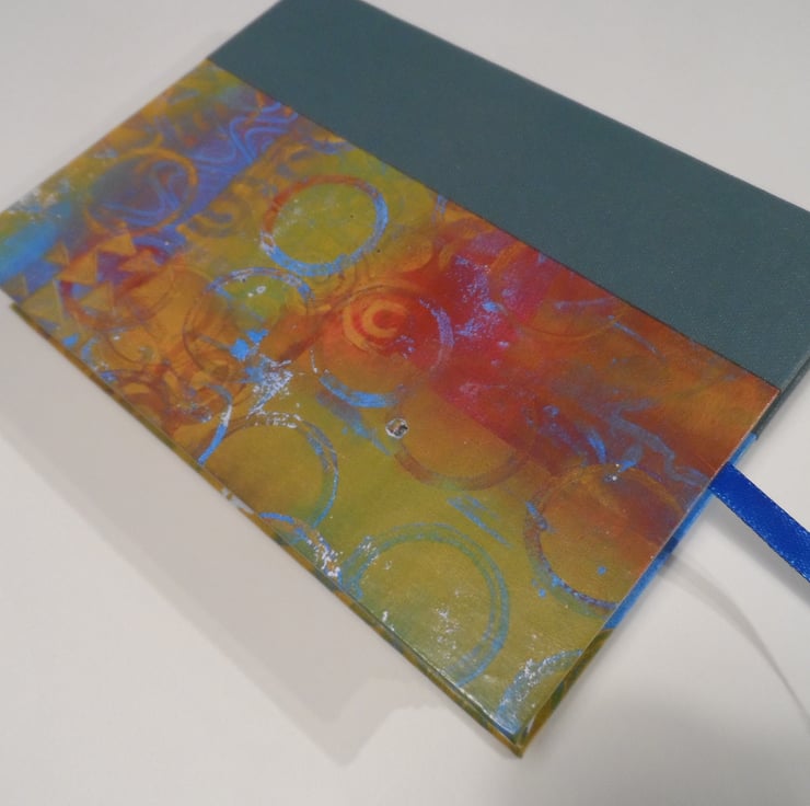 I have used one of my own gel plate mono-printed papers for the cover, and the spine area is reinforced with a sea green book cloth.