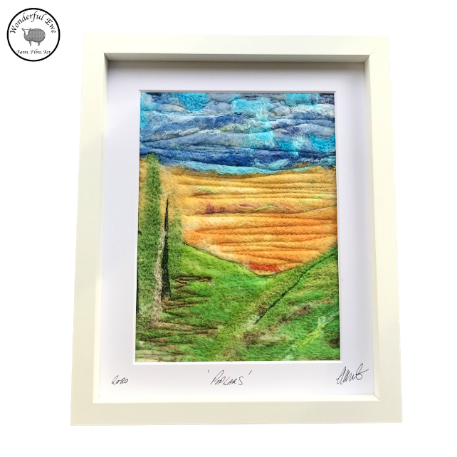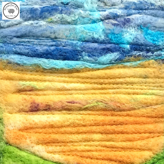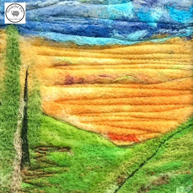 This felt painting shouts summer. It has shades of blue and white wool and silks for the sky and greens and browns for the fields.