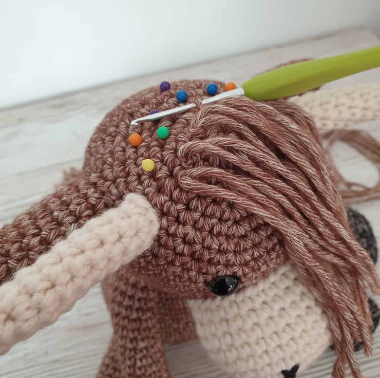 The 10 page pattern is intermediate skill level and uses UK terminology – if you would prefer US terminology, please message me. It is clear to follow with detailed instructions and lots of pictures for step by step making and assembly. There are also picture instructions for colour change, back loop only, the tail and hair.