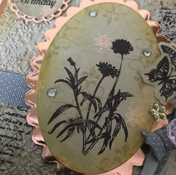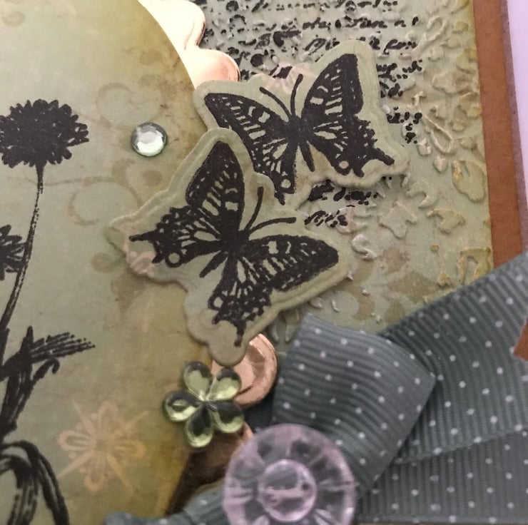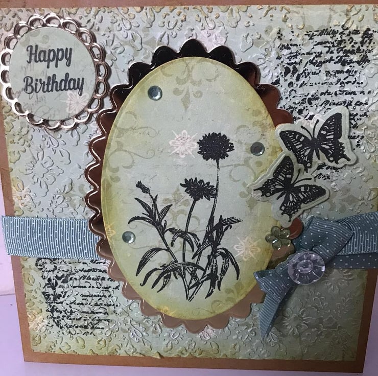 Lovely birthday greetings card with lovely detailing, gems, bow, embossing, stamping, butterflies - card is good quality Kraft card and measures 6x6" and the message on an insert inside the card reads 'With Love'