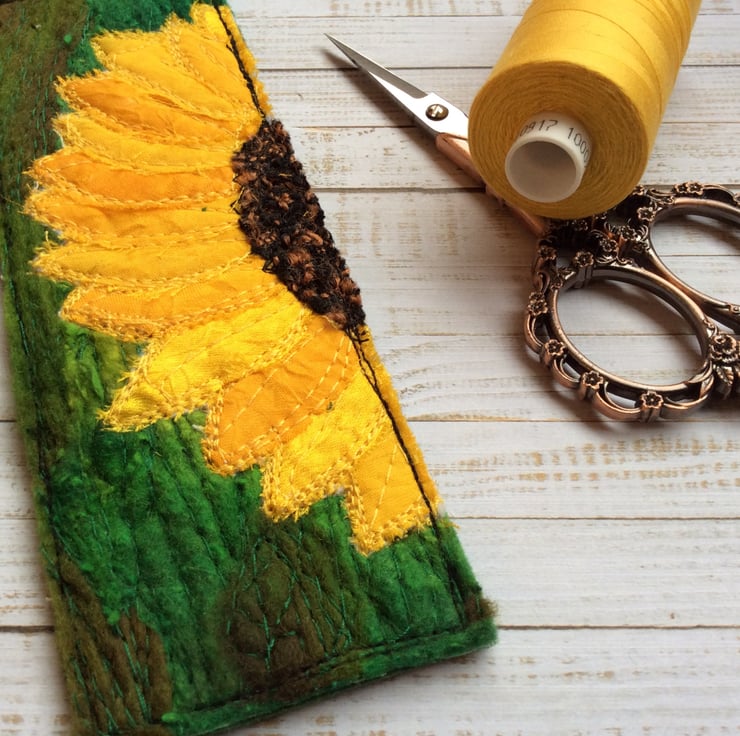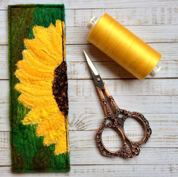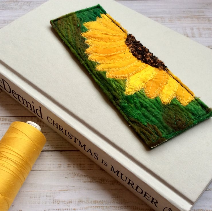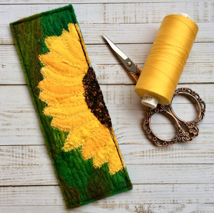 This embroidered sunflower bookmark is made from up-cycled sari and wool. It’s been enhanced with recycled pre felt trim and free motion embroidery, and it’s felt backed. The bookmark measures 16 x 5.5cm.