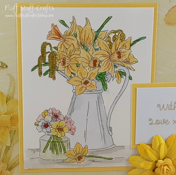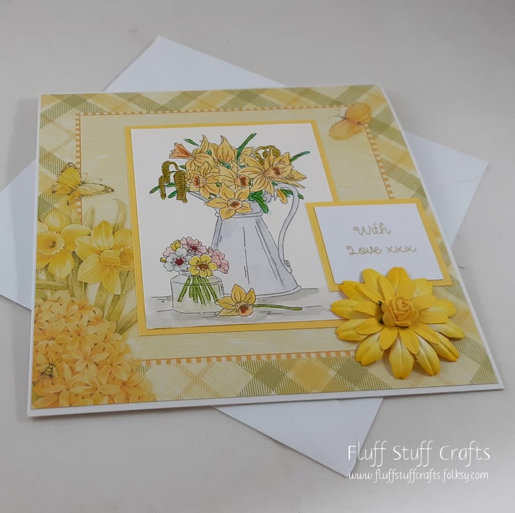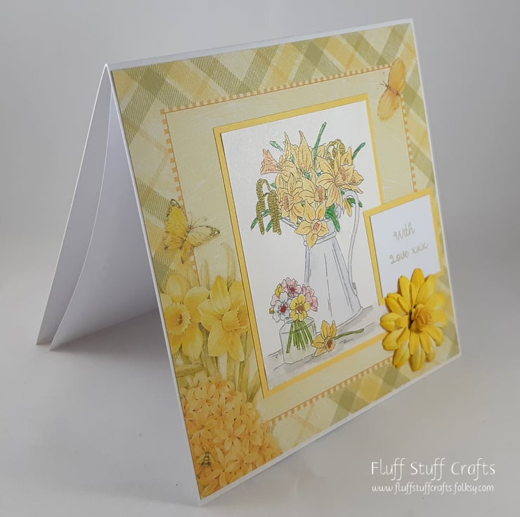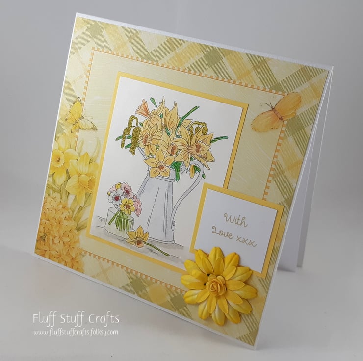 Square, handmade greetings card, suitable for any occasion. The card features a hand coloured image of a vase of daffodils and is mounted on yellow card, over a daffodil and butterfly patterned background. The sentiment reads: 'With Love xxx' and the card is embellished with yellow paper flowers. The insert is left blank for your own message.
