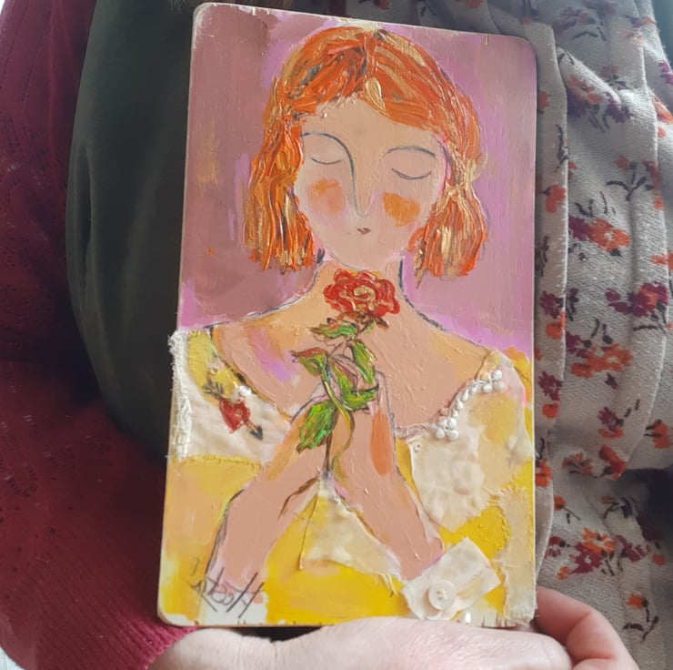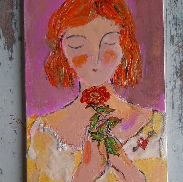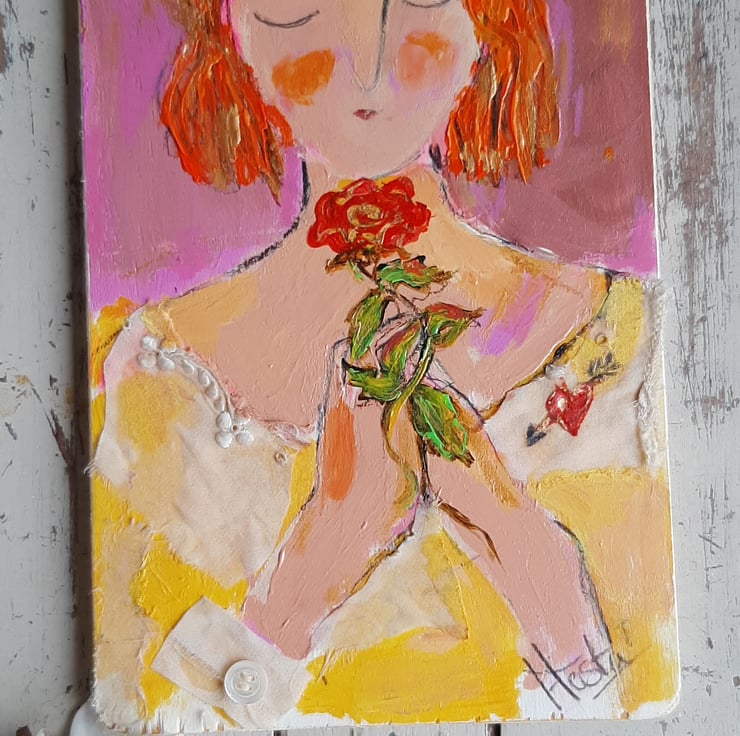 This original mixed media painting on reclaimed wood is full of texture with vintage lace trim and tiny mother of pearl button. One off by artist Hesta Singlewood aka bodkincreates on Instagram. A sweet love token painting meauring 20 cm tall 12 cm wide . Ready to hang with hook on the back .A confident and contemporary painting full of love x