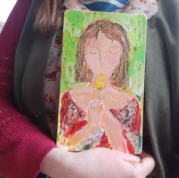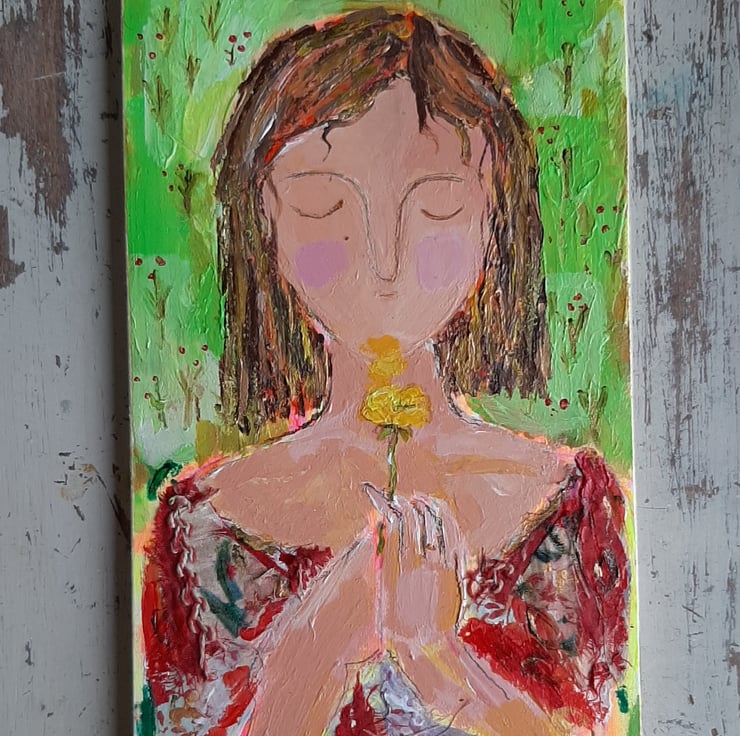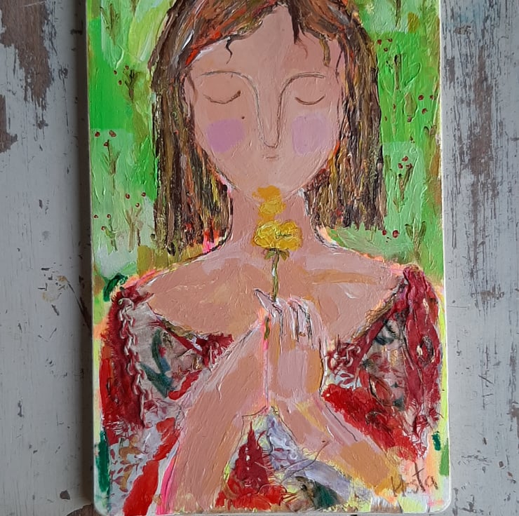 A positive little painting of hope .Full of colour and texture, vintage fabric on her dress and texture throughout the painting. By artist Hestasinglewood aka bodkincreates on Instagram. An original one off signed and ready to hang .a collectable, contemporary painting. Measuring 20 cm.tall 12 cm wide