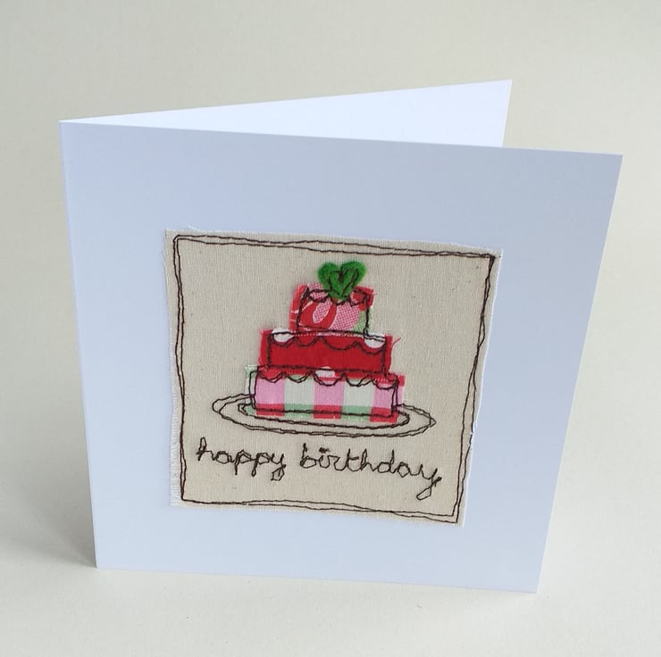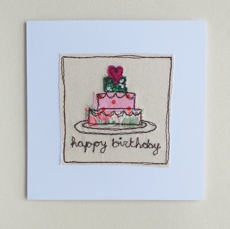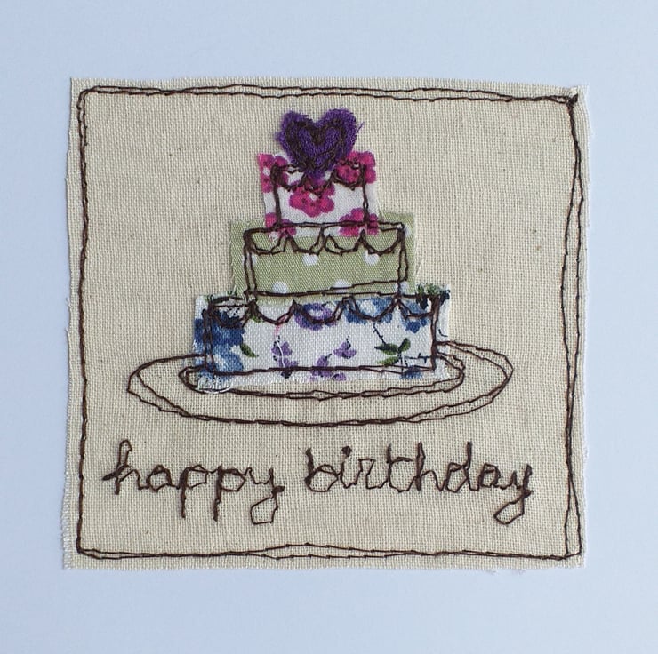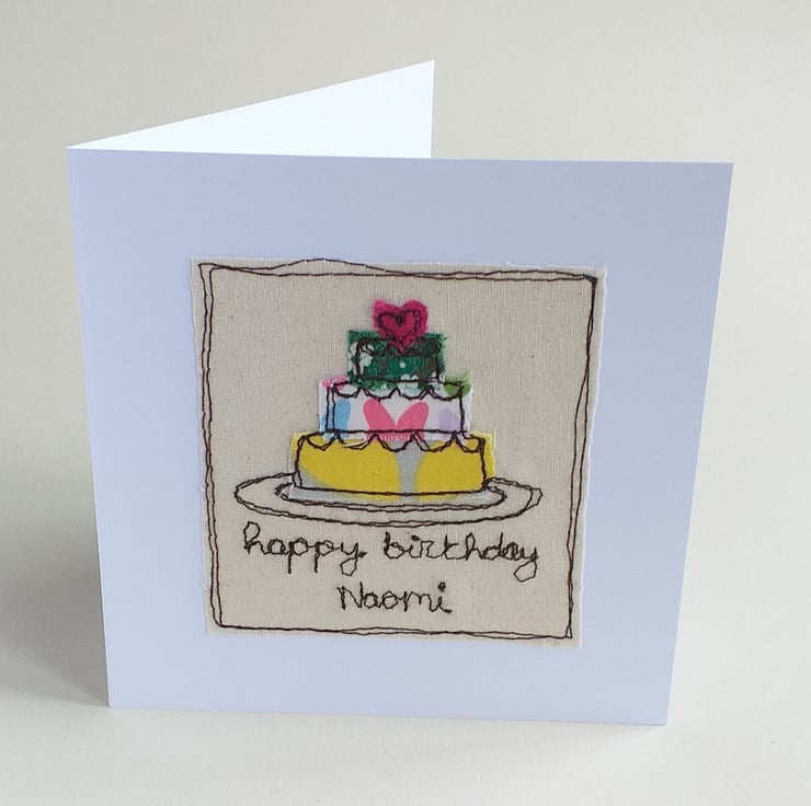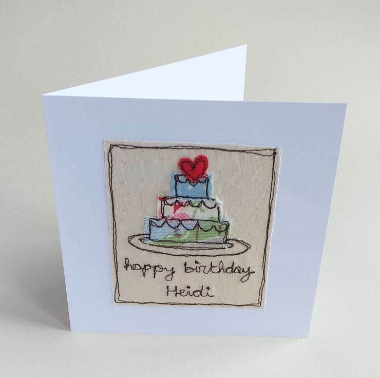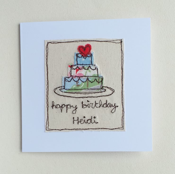 This detailed card features a 3 layer birthday cake topped with a heart. It is made from fabric scraps embroidered with freestyle machine embroidery. It says "happy birthday " on the front with your choice of name added. There is also the option to choose fabric colours if you wish.