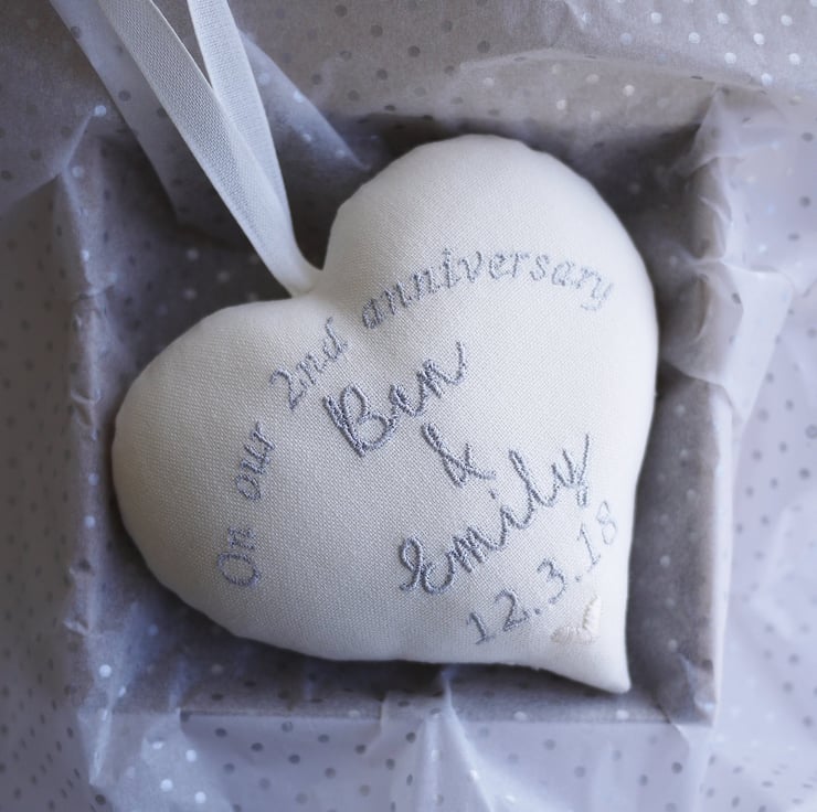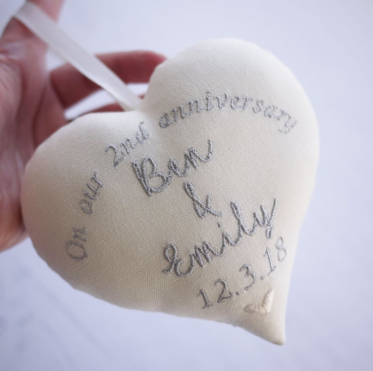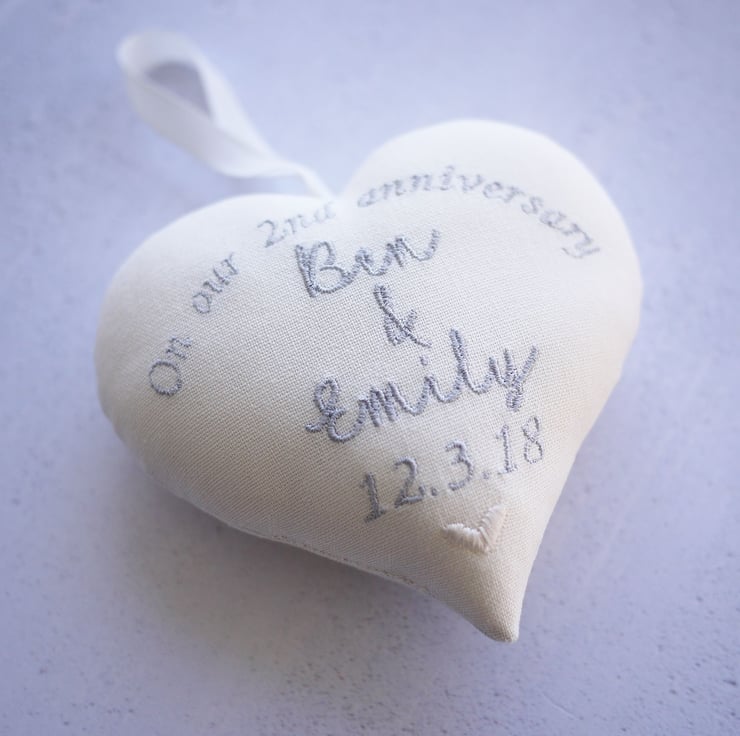 A beautiful personalised cotton anniversary heart handmade in a lovely soft cream cotton fabric and then personalised with the name or names and date of your choice embroidered in silver grey thread. (if you would like a different colour text please message me I have all colours available.) The heart is decorated with a mini cream embroidered heart under the text and is finished with a matching cream cotton hanging ribbon. This is a gorgeous keepsake personalised gift to celebrate a 2nd wedding anniversary.