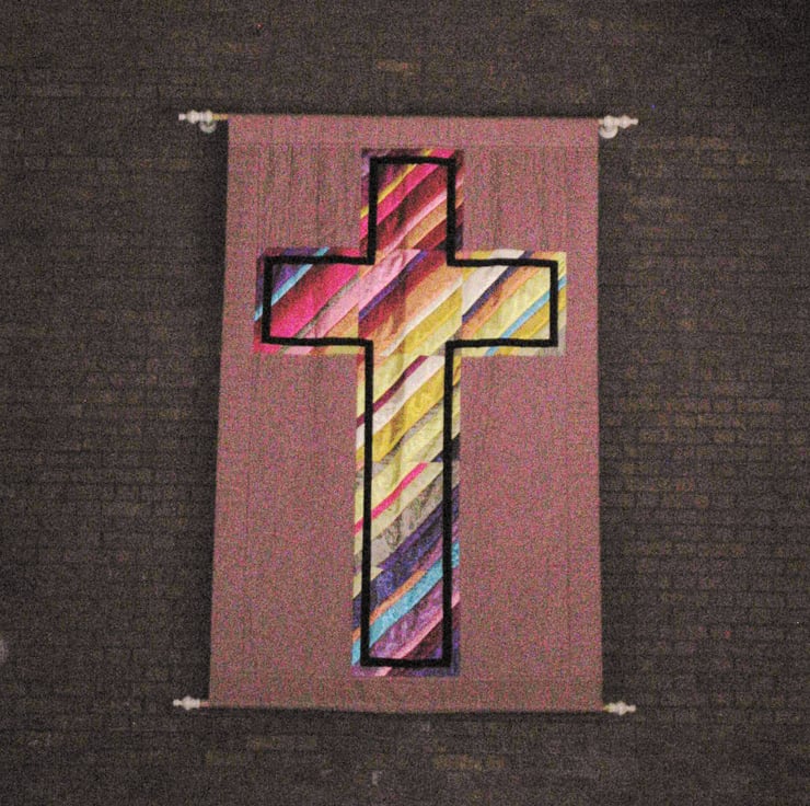 This design is based on a huge banner (1800 x 3000 mm) I designed for the front of St John's Church in Walmley, Sutton Coldfield (see photo). That was many years ago - but I found I still have scraps of the satin fabrics in my stash and I thought it might be nice to use them to make smaller versions of the cross for church members to have at home. I've added some chain stitch embroidery to add texture and a simple wooden frame.