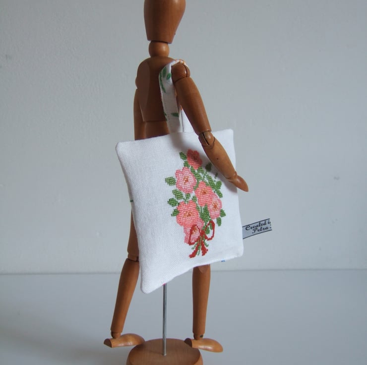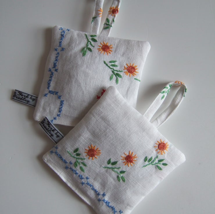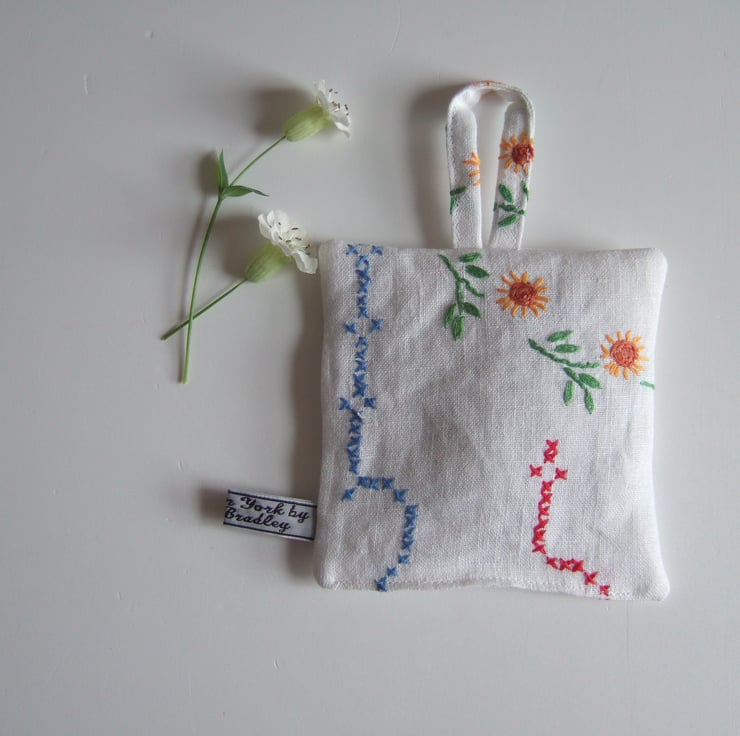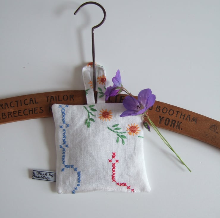 This lavender bag is made from two lovely vintage embroidered fabrics, both with a Folk Art style. The front is from an old vintage table cloth worked in a tapestry effect stitch, and the back is a section from a tray cloth, both with a softly washed feel. Inside is nestling a little bag of dried lavender from North Yorkshire. Pop it in a drawer for sweet smelling clothes, or under your pillow for healthy sleep. This little bag would make a lovely present for someone learning to embroider, for a fan of vintage textiles, or a little gift for Mum.