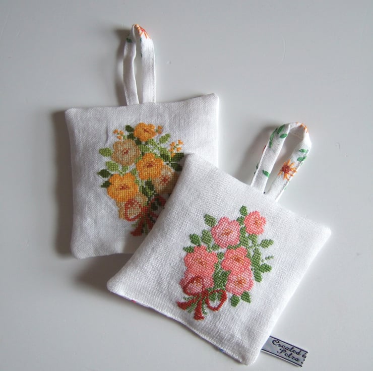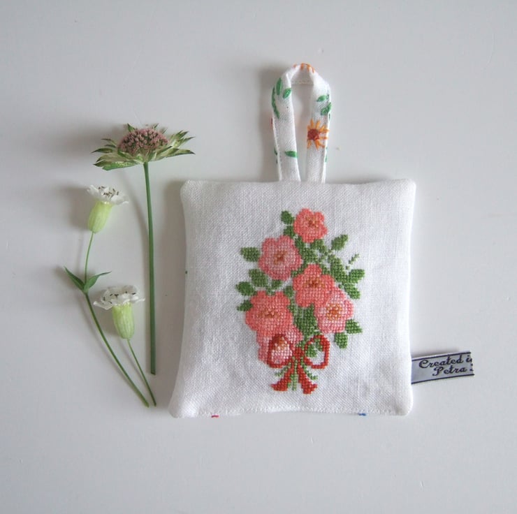 The front is floral cross stitch and the back has a border of geometric flowers and some tiny drawn thread holes to let the scent escape.