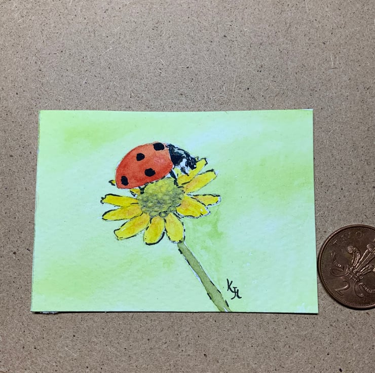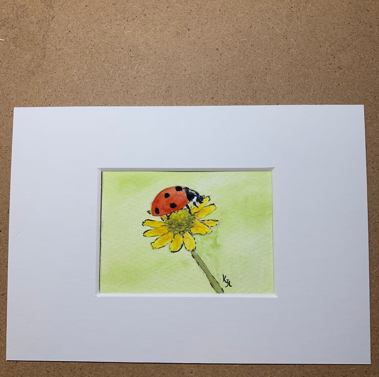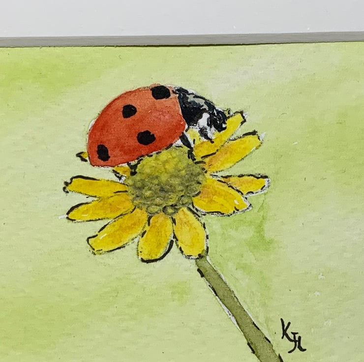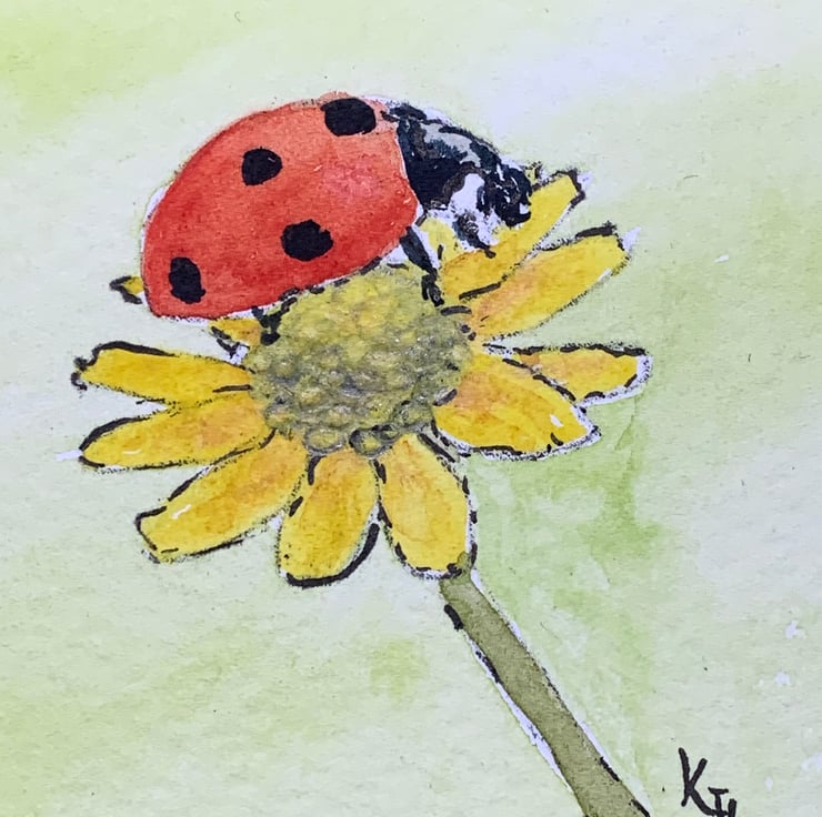 Original artwork of a beautiful ladybird or as some people call them ladybug sitting on a yellow flower. I have used professional artists pens and artist grade watercolour paints, on textured white 300gsm This is an original not a print!